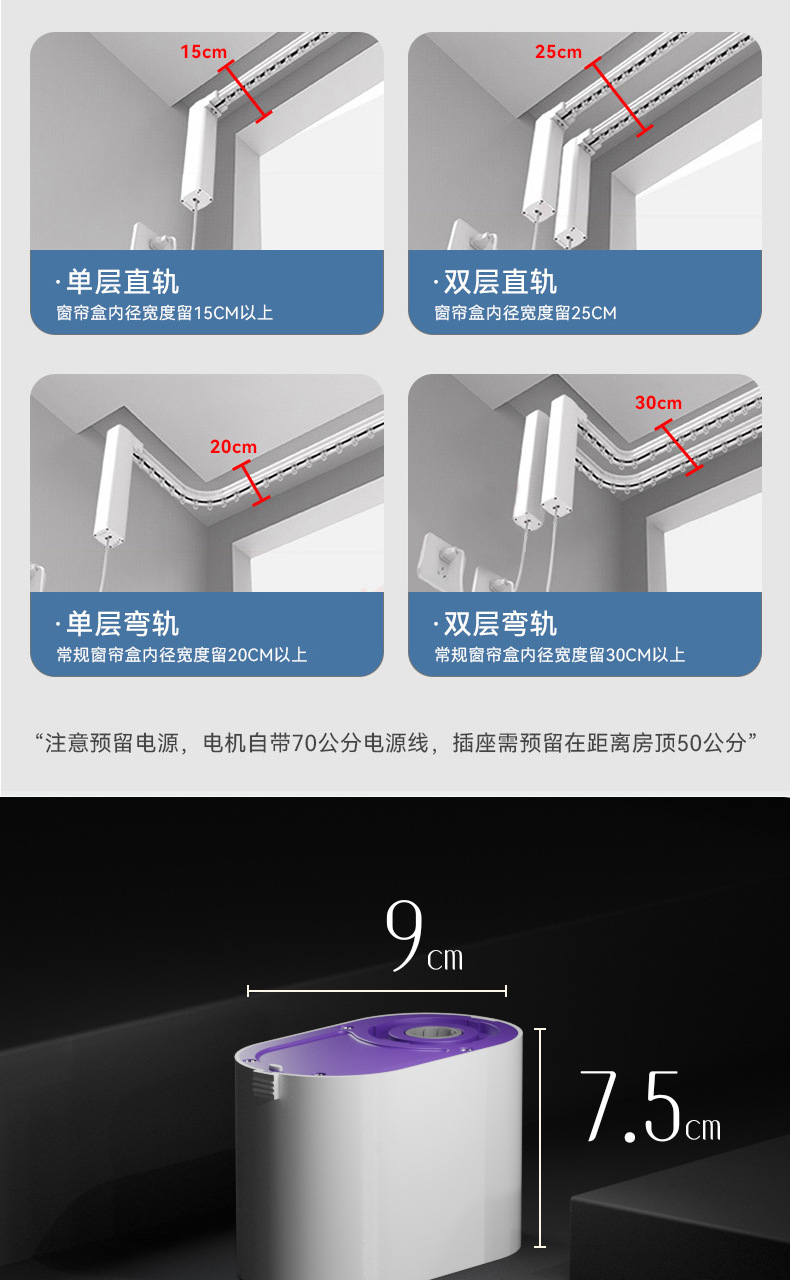1.轨道尺寸【麻烦提供A墙到B墙得实际尺寸,默认在提供得实际尺寸上减尺3cm,其目的是方便安装得时候左右两边轨道不顶墙,预留挂窗帘得空间】;