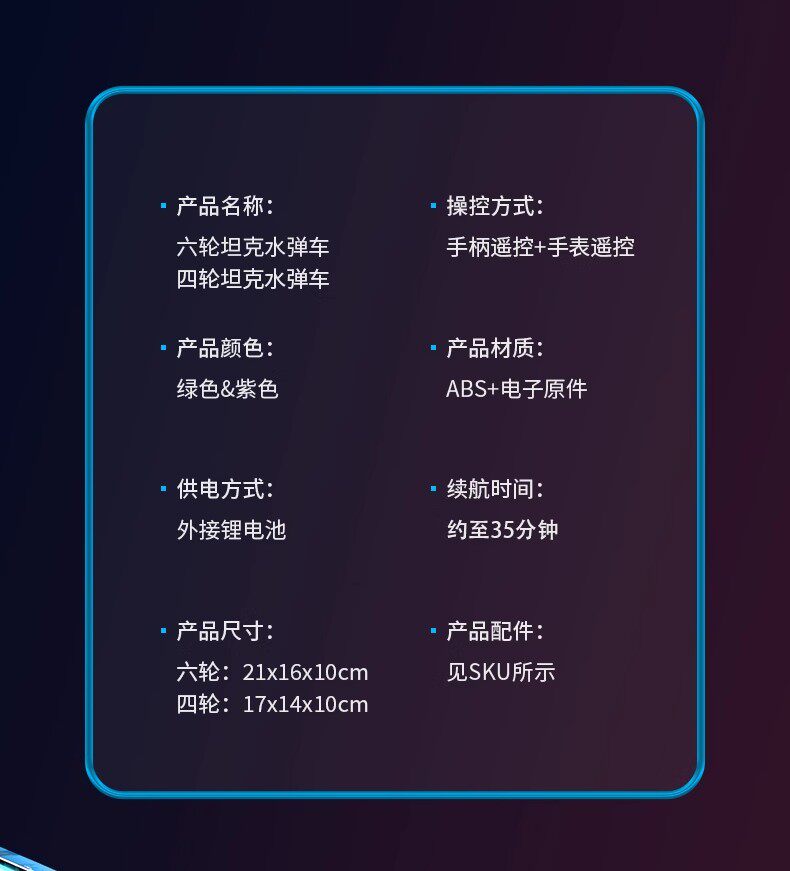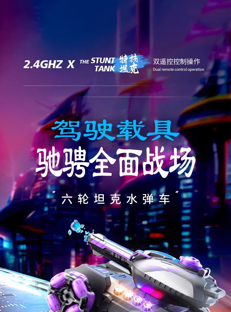 ![]() | 391 six-wheel stunt water bomb tank vehicle [handle single remote control] purple | [standard configuration for single battery] battery life is about 35 minutes | ¥50.8 / ≈ 612 ₽ | 867 | 6105315059360 | |
