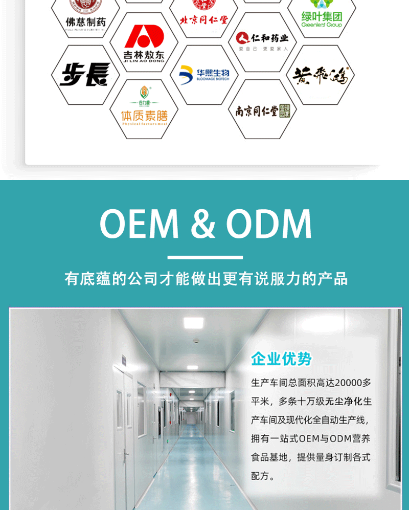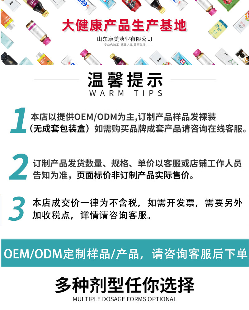 本公司以提供大健康功能性食品OEM/ODM贴牌定制服务为主,此链接为加工定制类产品,并无现货,产品无包装、无文字介绍,加工定制类客户咨询客服免费拿样,零售及批发客户下单前请咨询客服有无现货,感谢您的支持。