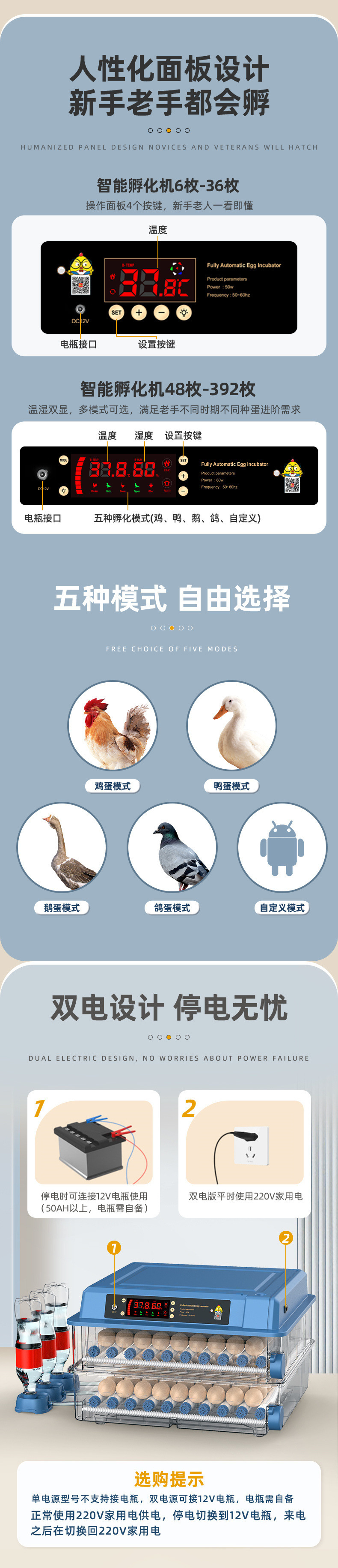![]() | Single battery model, fully automatic - 176 temperature and humidity dual displays [automatic egg turning + water replenishment] | ¥514.8 / ≈ 6 201 ₽ | 1000 | 5932894692442 | |