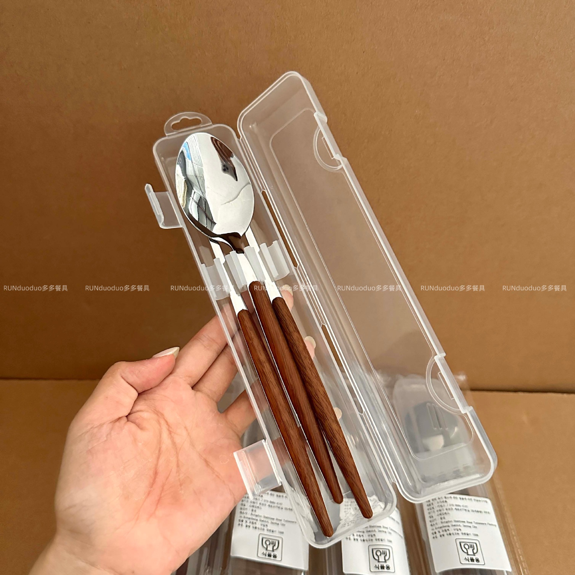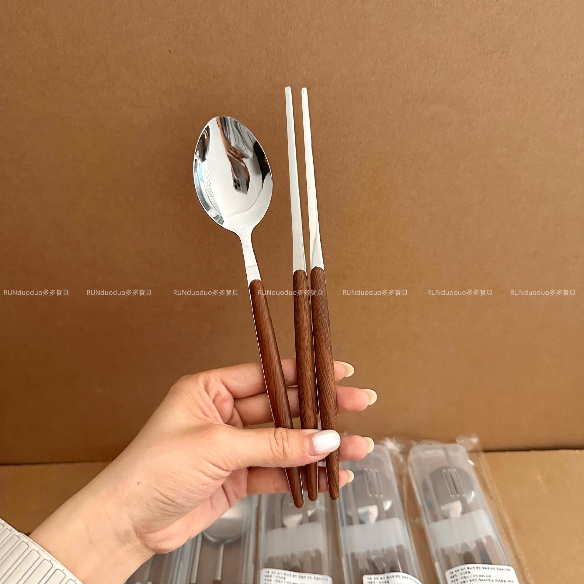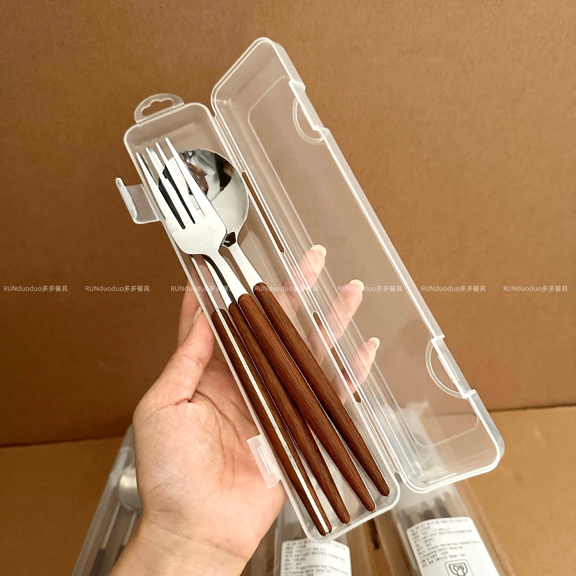 Портативная коробка для столовых приборов из нержавеющей стали, имитация деревянной ручки, набор палочек для еды, ложка, вилка, корейский трехпредметный набор для одного человека
