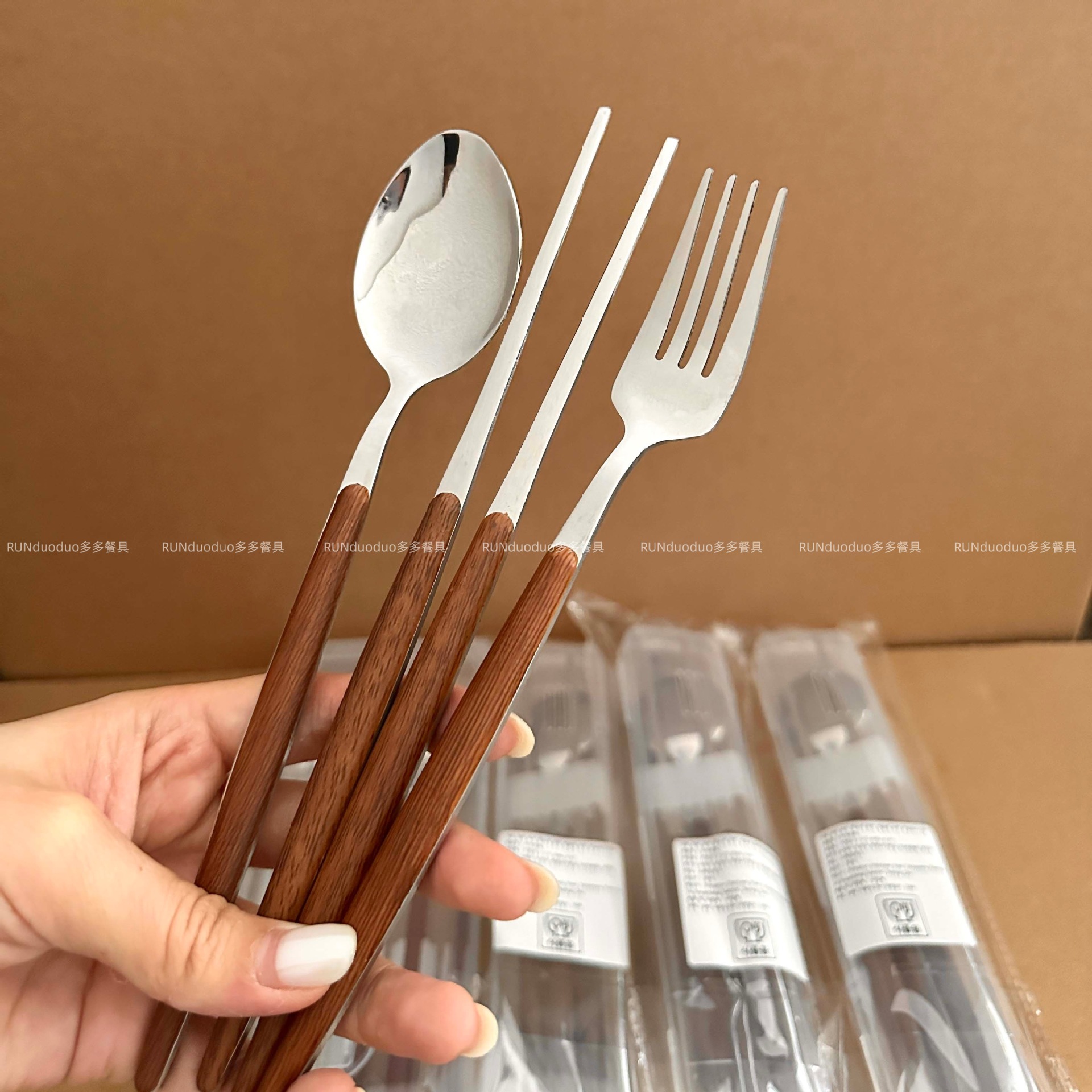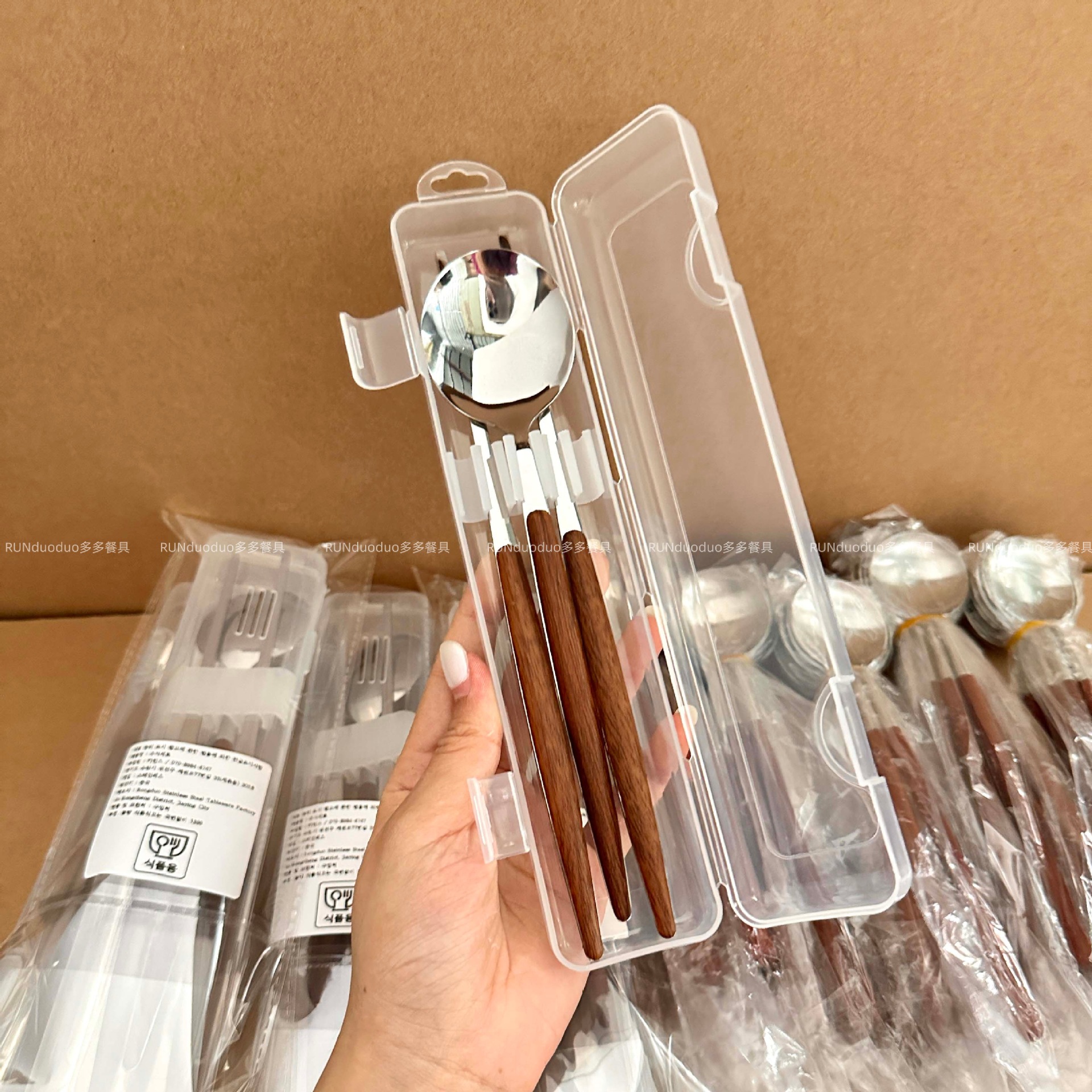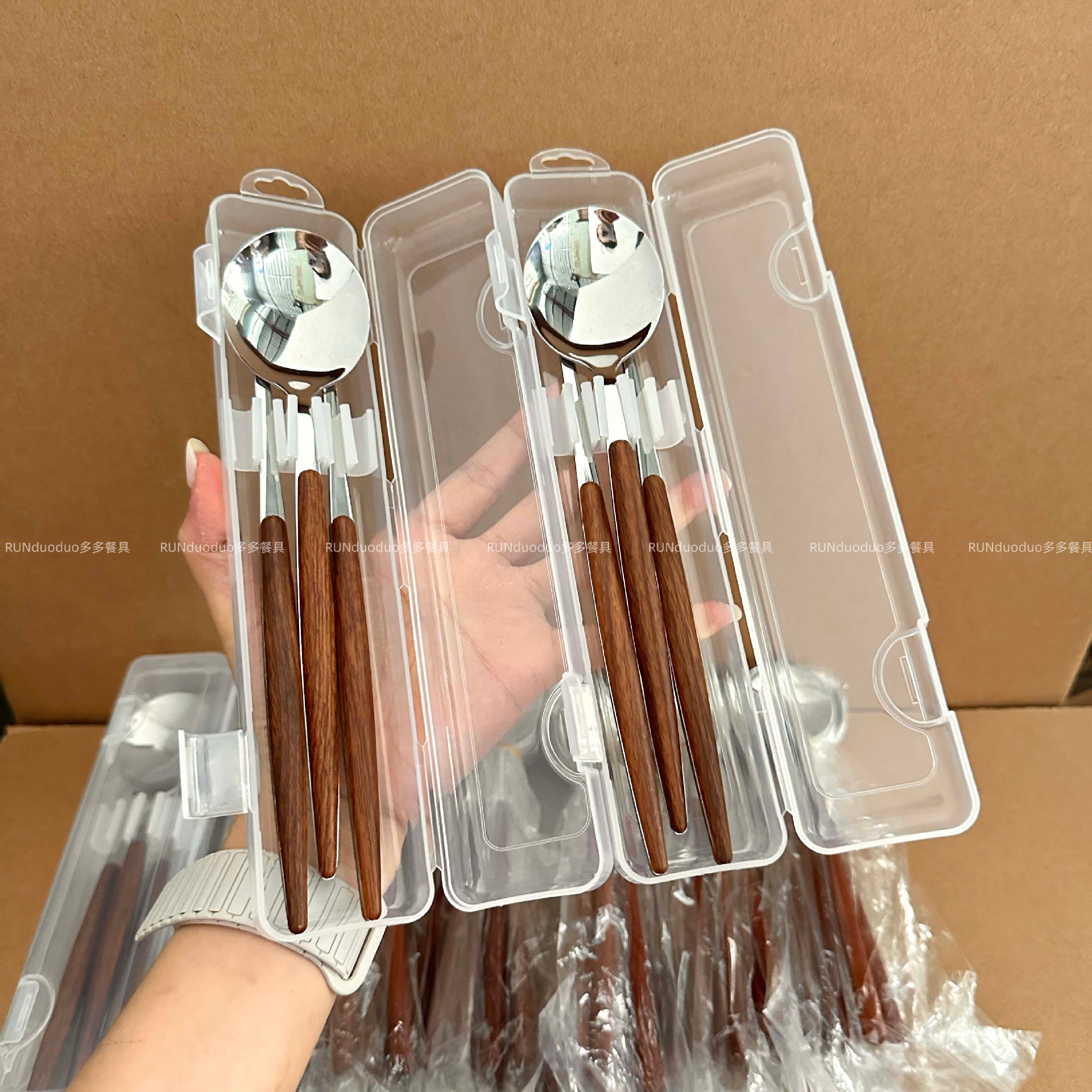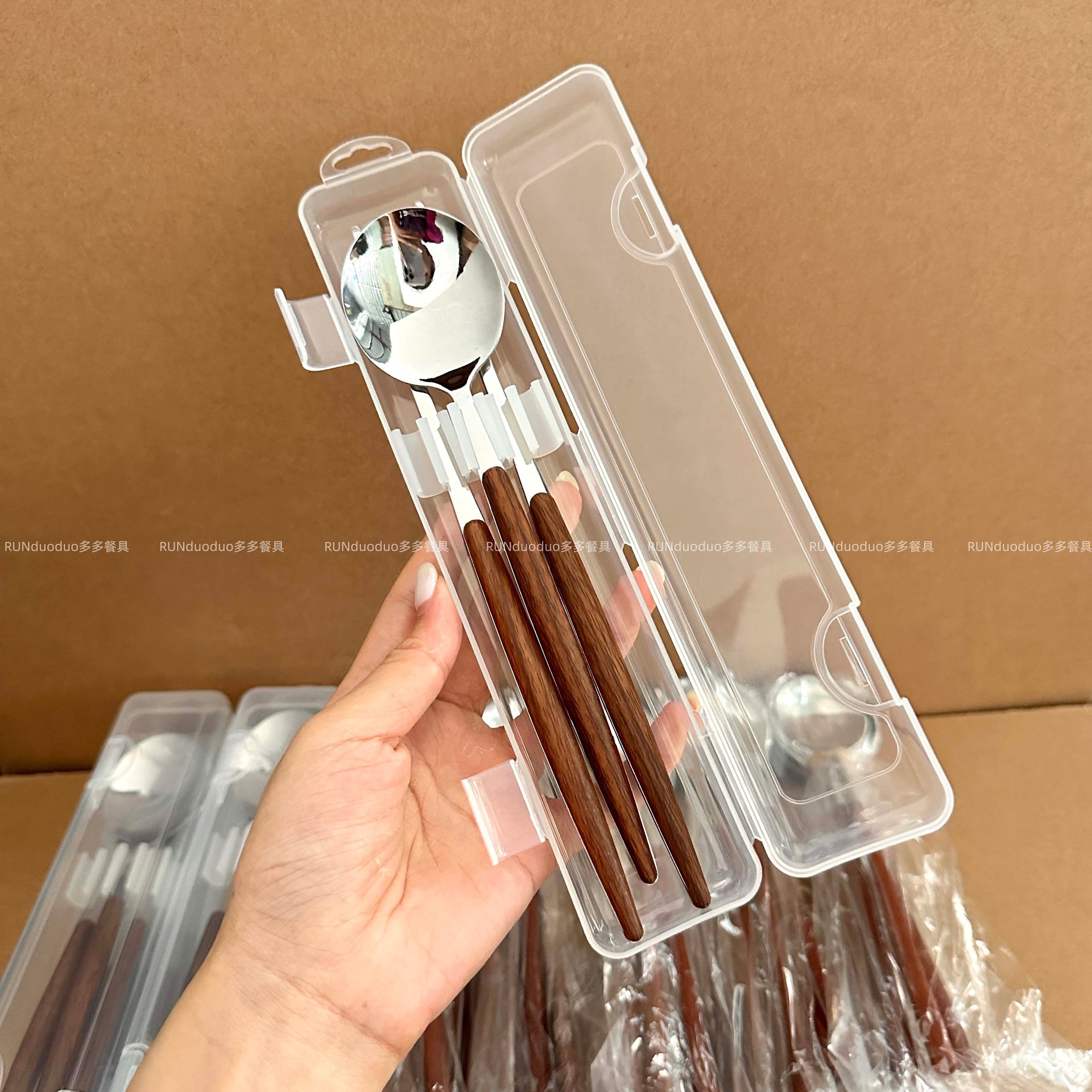 Портативная коробка для столовых приборов из нержавеющей стали, имитация деревянной ручки, набор палочек для еды, ложка, вилка, корейский трехпредметный набор для одного человека