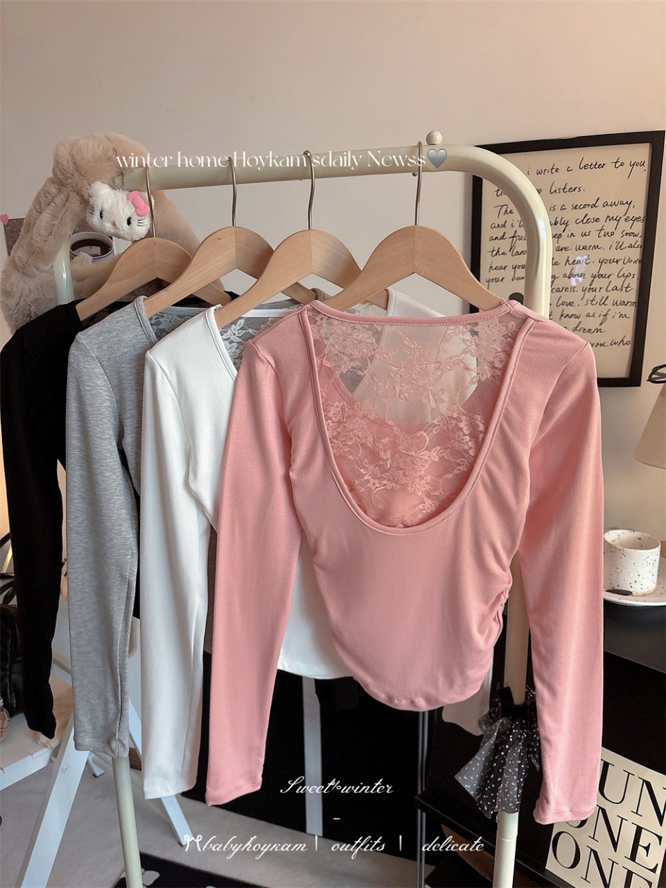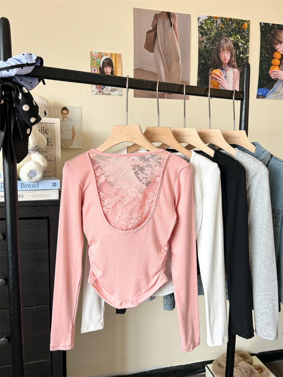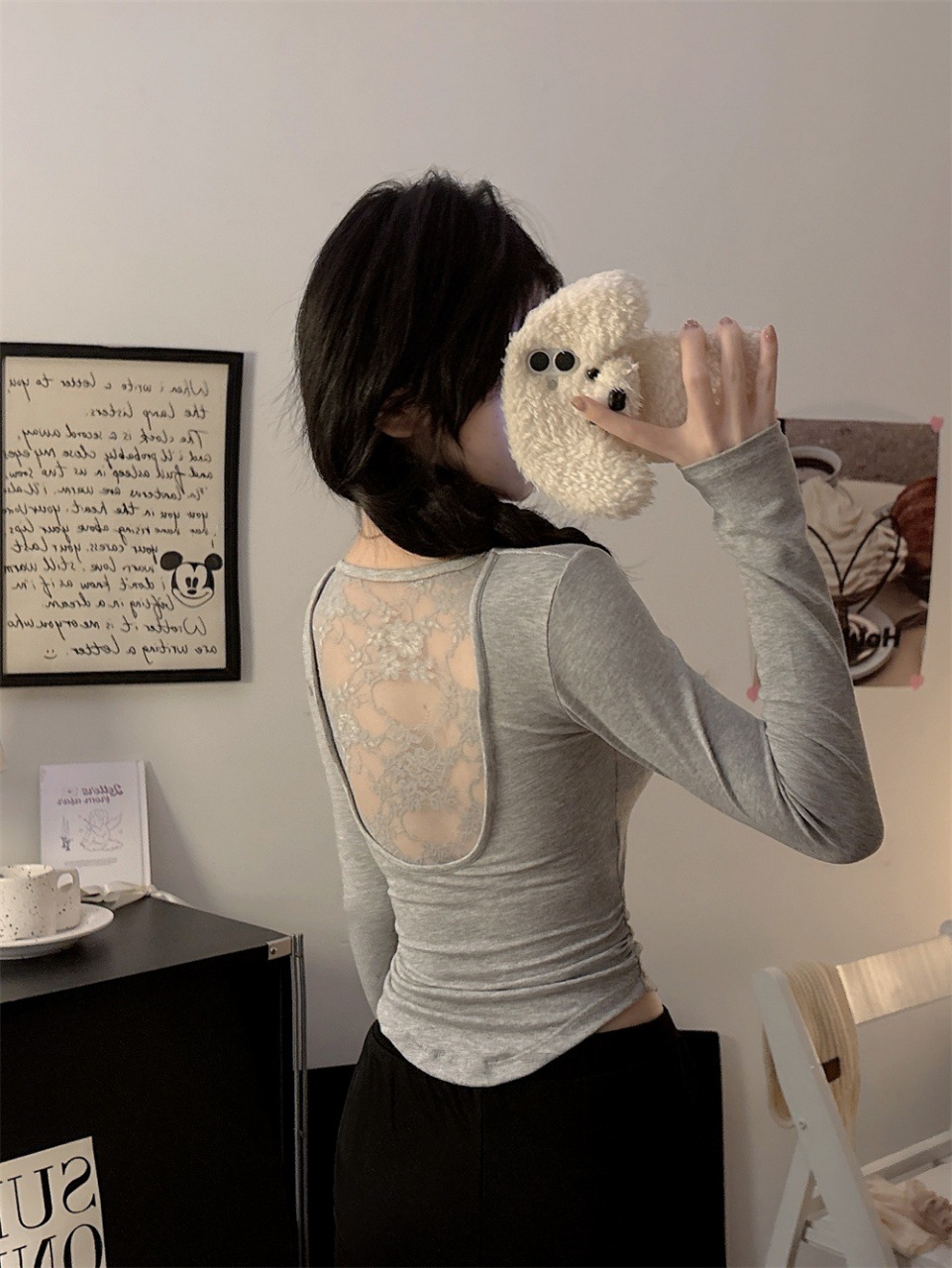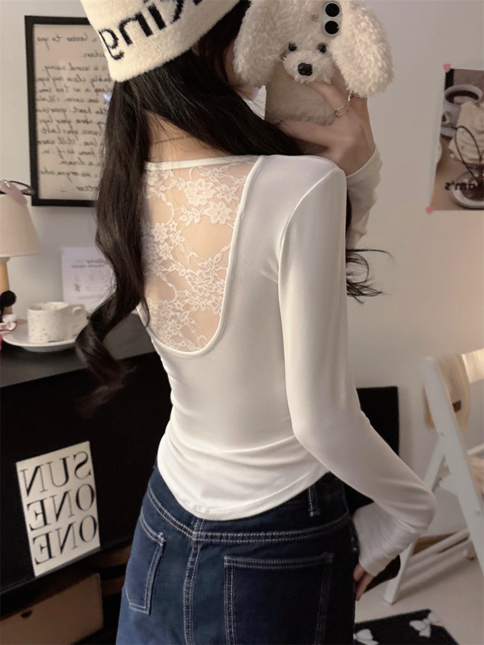 5165 Чистое желание, полое дизайнерское сексуальное блузка без спины, кружевная вставка, длинный рукав, облегающий базовый слой, модная блузка для осени и зимы