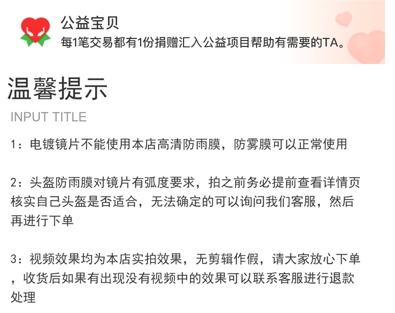 ![]() | (extended version) 1 piece of helmet rainproof film + 1 piece of sunscreen film [internal and external stickers] 2 pieces in total | ¥25.0 / ≈ 301 ₽ | 200 | 5933864116256 | |