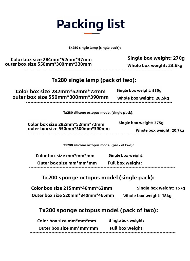 ![]() | Tx280-warm light-(single lamp) 160led | ¥22.5 / ≈ 274 ₽ | 98731 | 5945494384474 | |