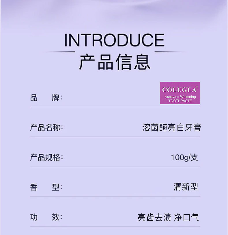 ![]() | 100g lysozyme whitening toothpaste | 3шт: ¥1.80, 720шт: ¥1.70, 7200шт: ¥1.60 | 400136 | 5937780020517 |