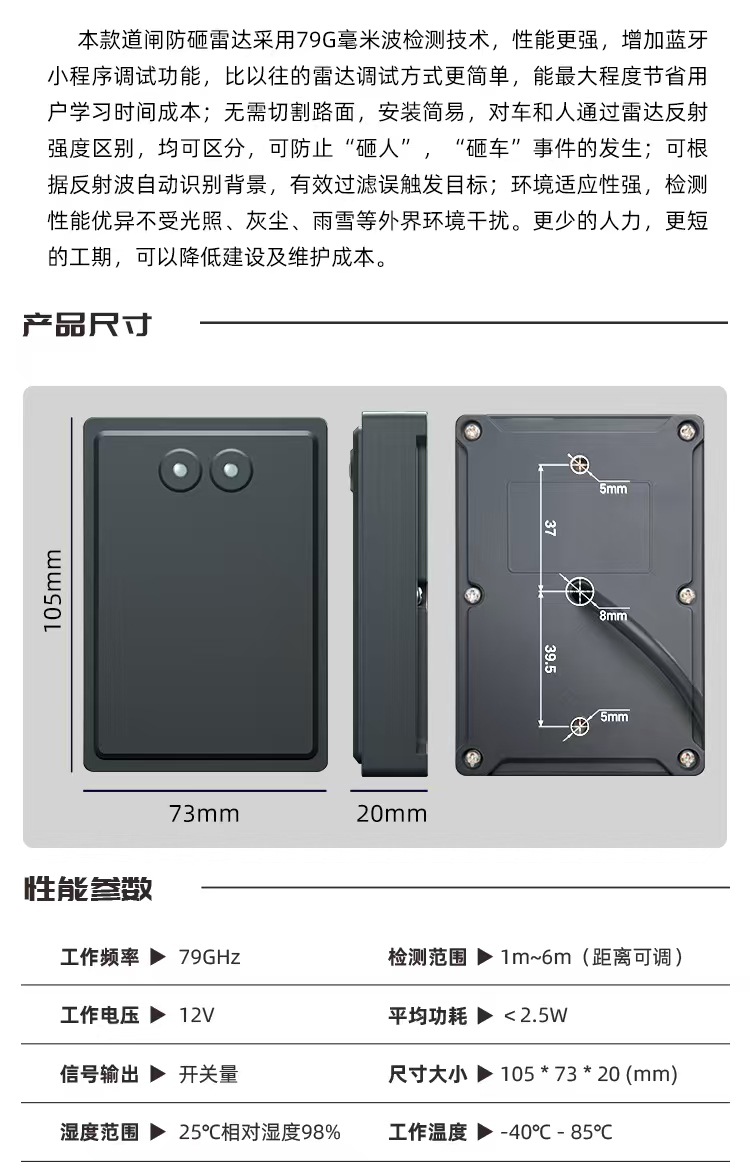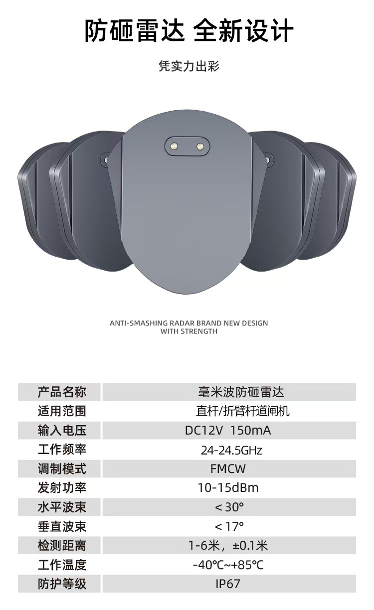 Точный антиудар Using radar detection technology, it can accurately identify vehicles, pedestrians and other objects within the range of 1 - 6m to prevent the barrier from hitting vehicles or pedestrians and ensure safe passage