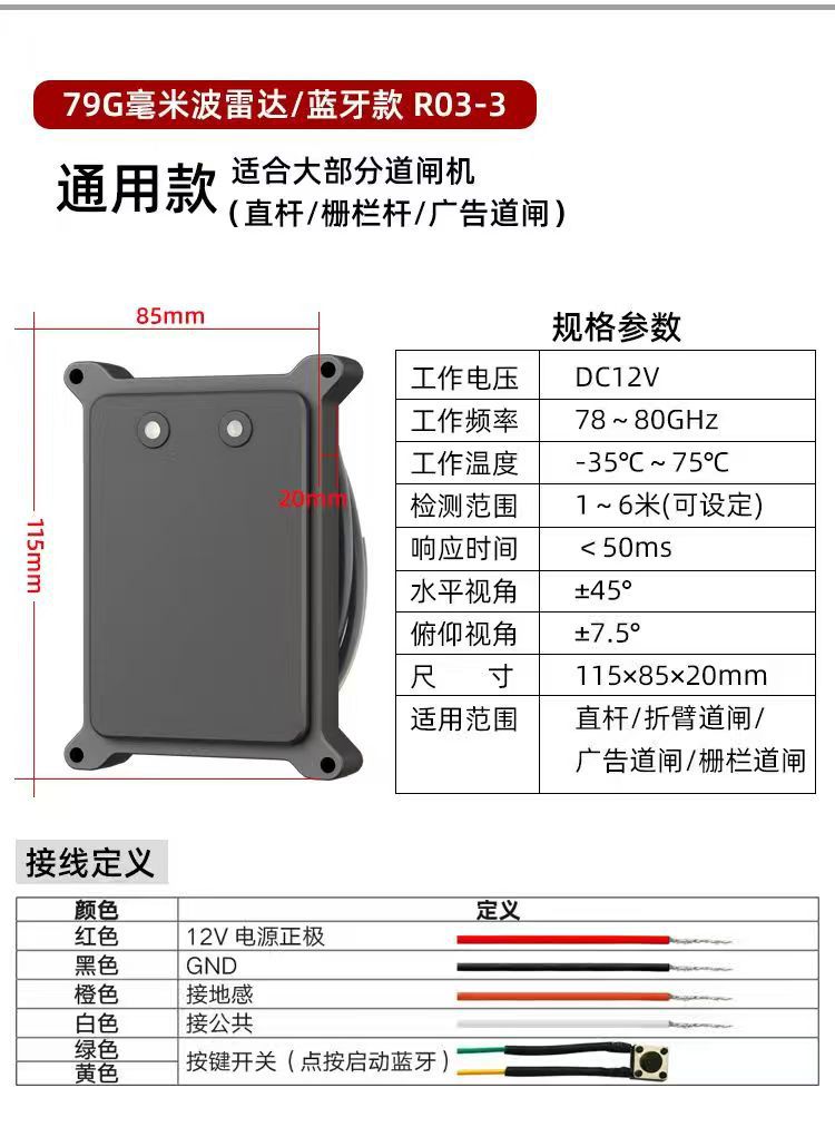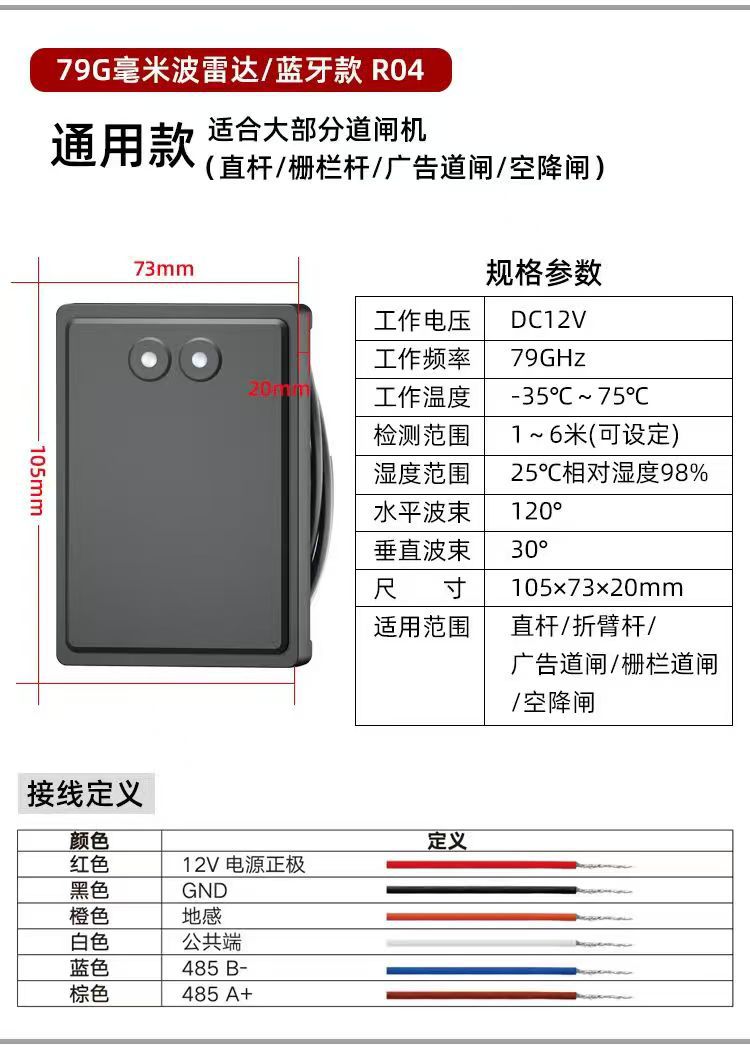 - 供电安全:雷达仅支持 12V 直流独立供电,严禁连接 220V 交流电,避免设备损坏或安全风险。