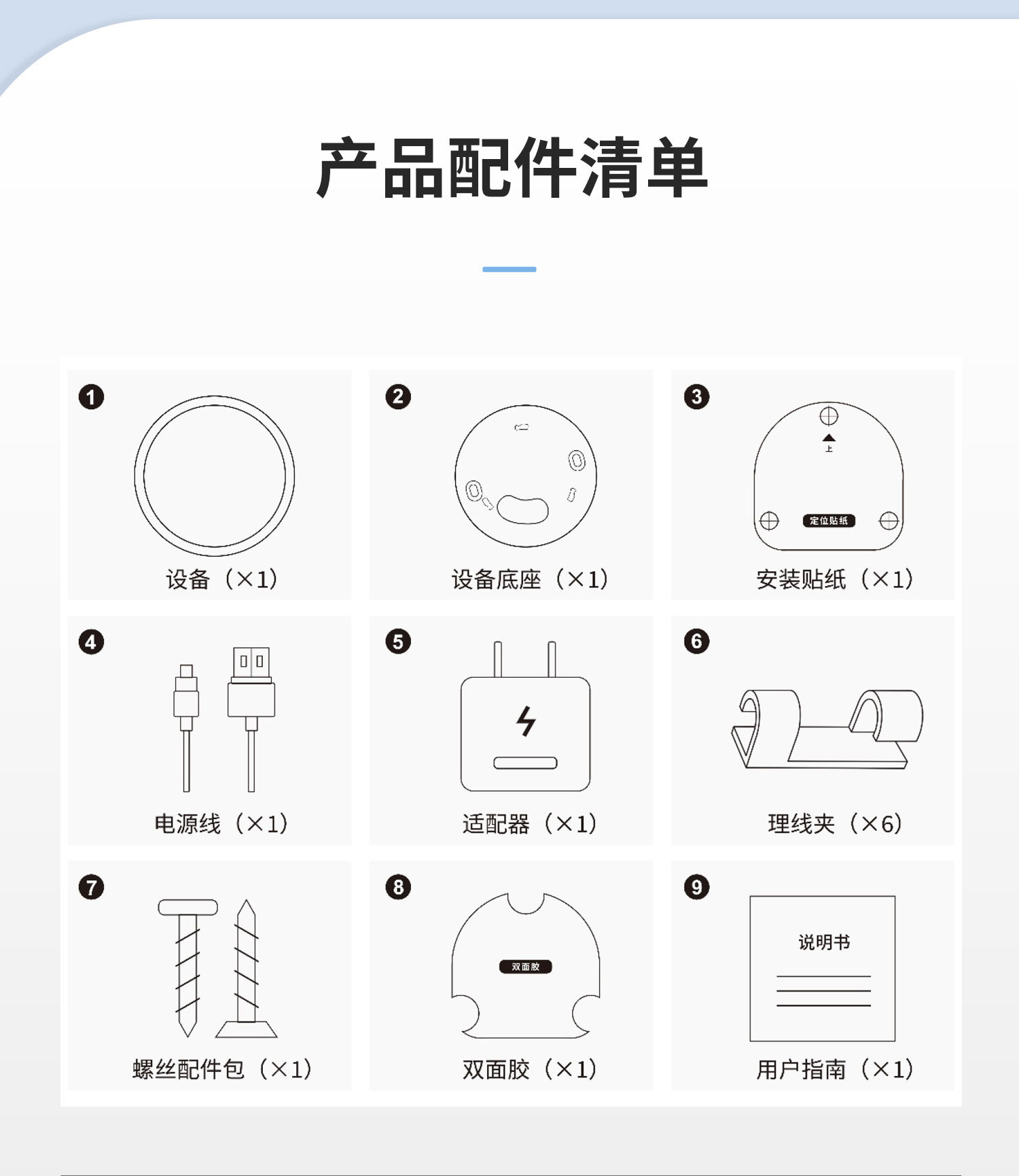 Список упаковки Device, device stand, installation stickers, power cord, adapter, cable management clip, screw accessory pack, double-sided tape, user guide