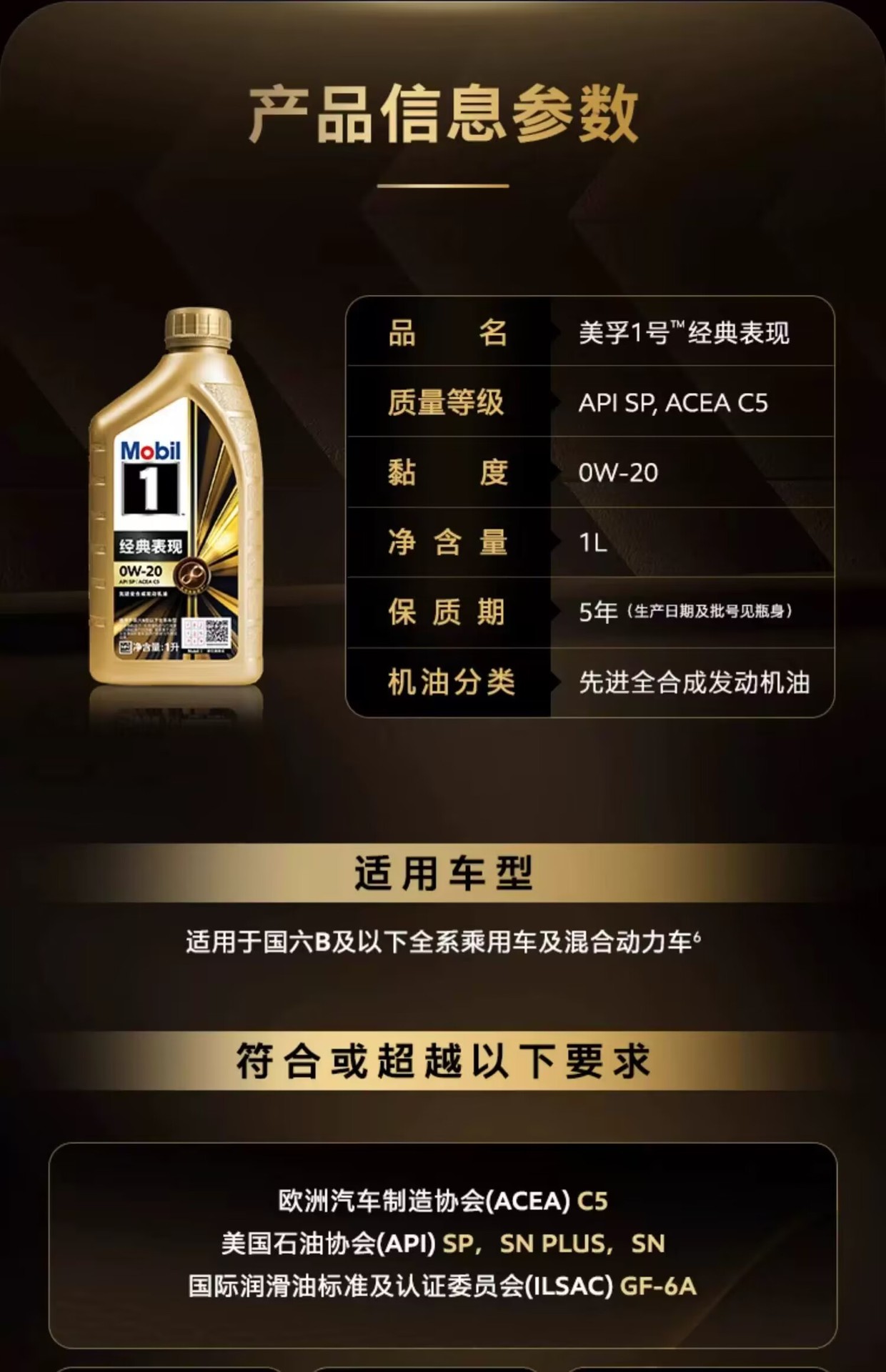 Golden Mobil Classic No. 1 0W20 Полностью синтетическое масло Sp Grade 1L Специальная упаковка