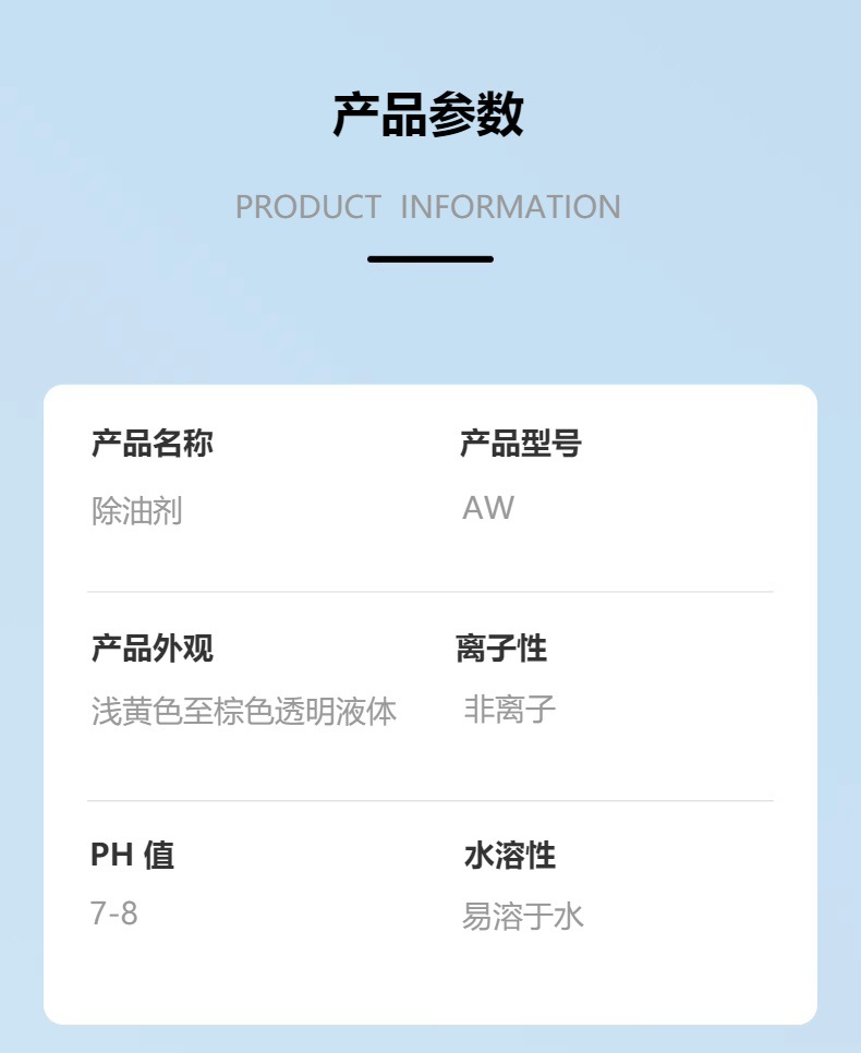 Краткое введение в продукты For removing silicone oil finish and surfactants from cotton and synthetic fiber blended fabrics, or for use as a detergent on silicone-treated fabrics.