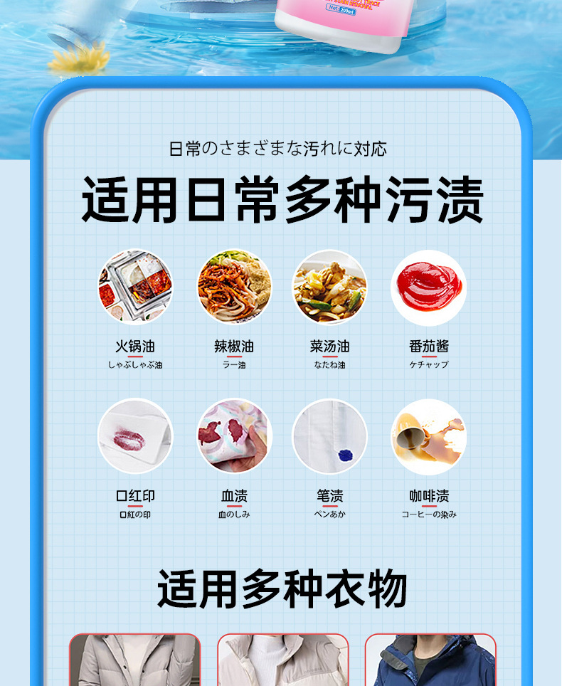 ![]() | [1 bottle] trial pack, easy to deal with various stains | ¥2.3 / ≈ 28 ₽ | 99989 | 5941118241433 | |