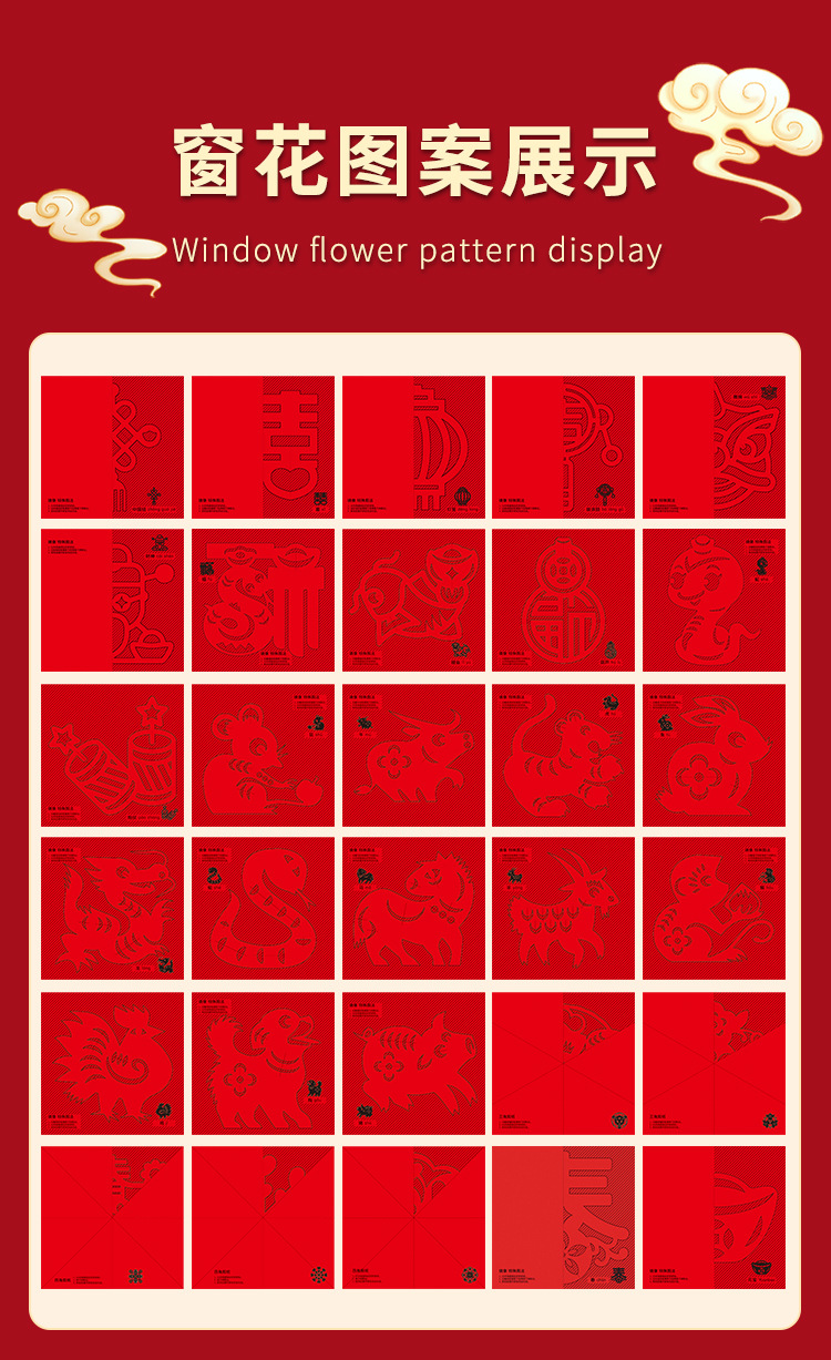 ![]() | Size 17*17cm | 60 window grilles for the year of the horse + 1 pair of safety scissors | ¥3.0 / ≈ 36 ₽ | 99680 | 5936691556432 | |
