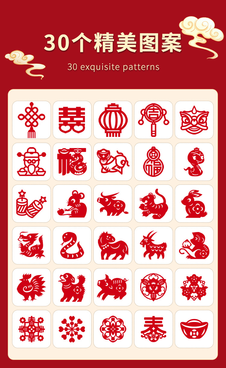![]() | Size 17*17cm | 30 window cutouts for the year of the horse + 1 pair of safety scissors | ¥2.0 / ≈ 24 ₽ | 99978 | 5936691556431 | |