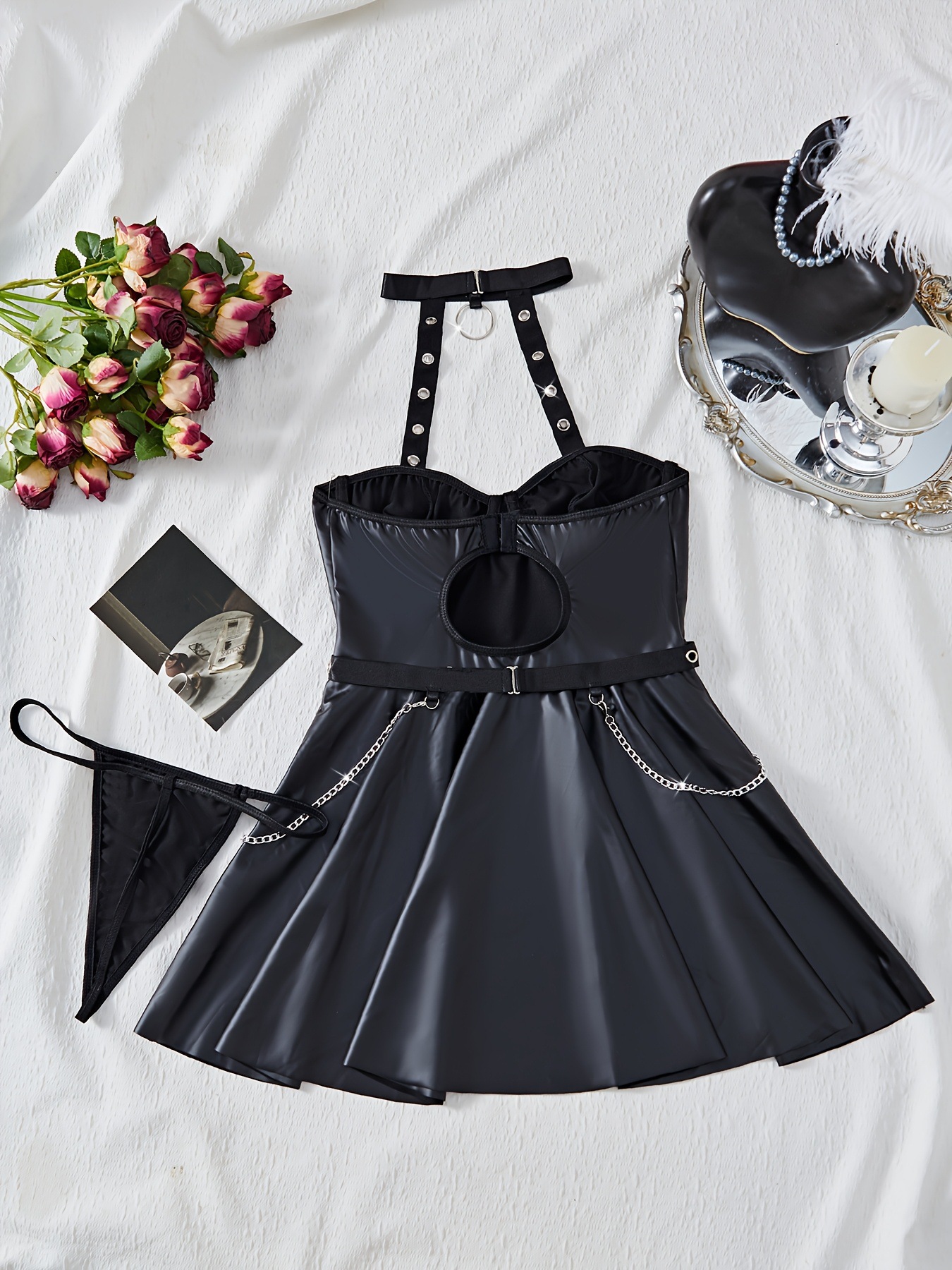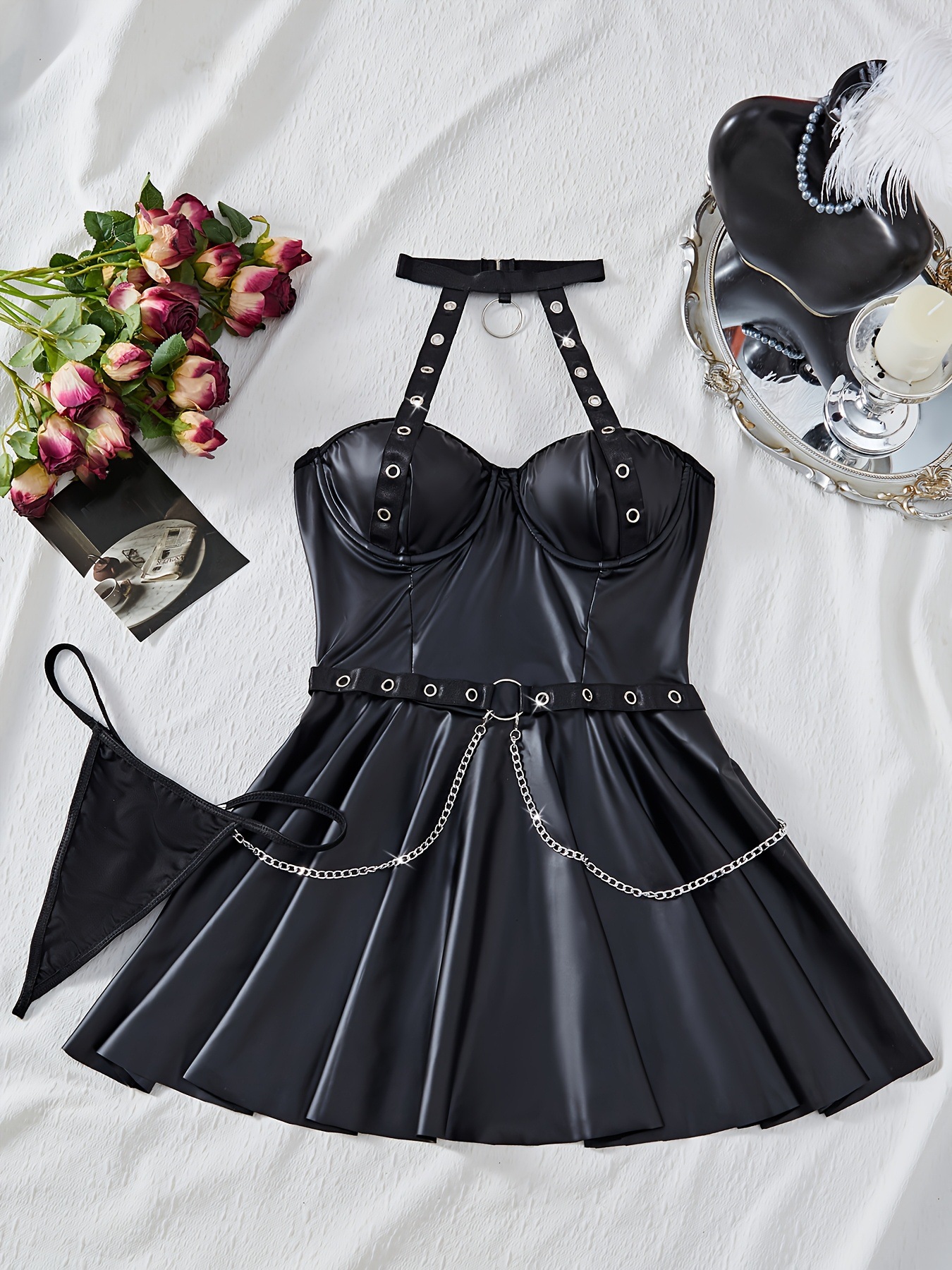 Кросс-бордерный новый сексуальный комплект нижнего белья, короткое платье из PU-кожи для ночного клуба, сексуальное без спины, платье с завязками, соблазнительная униформа