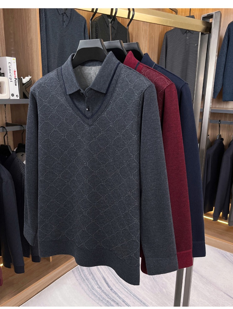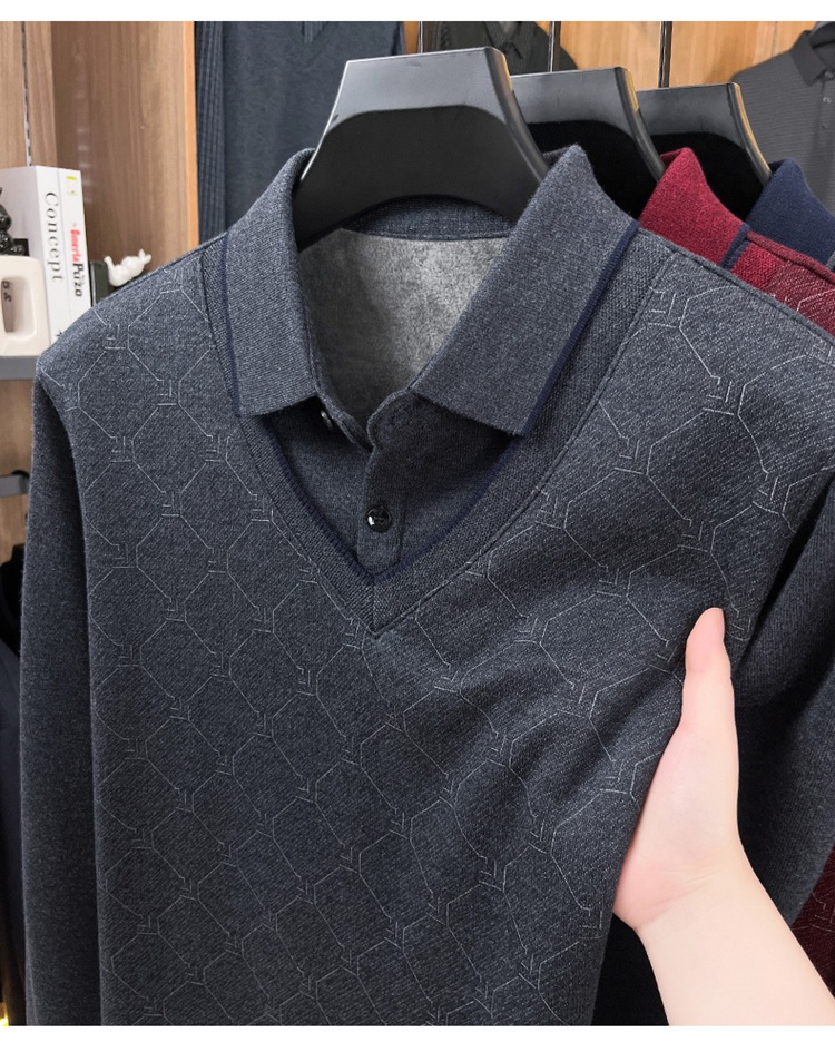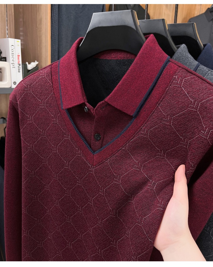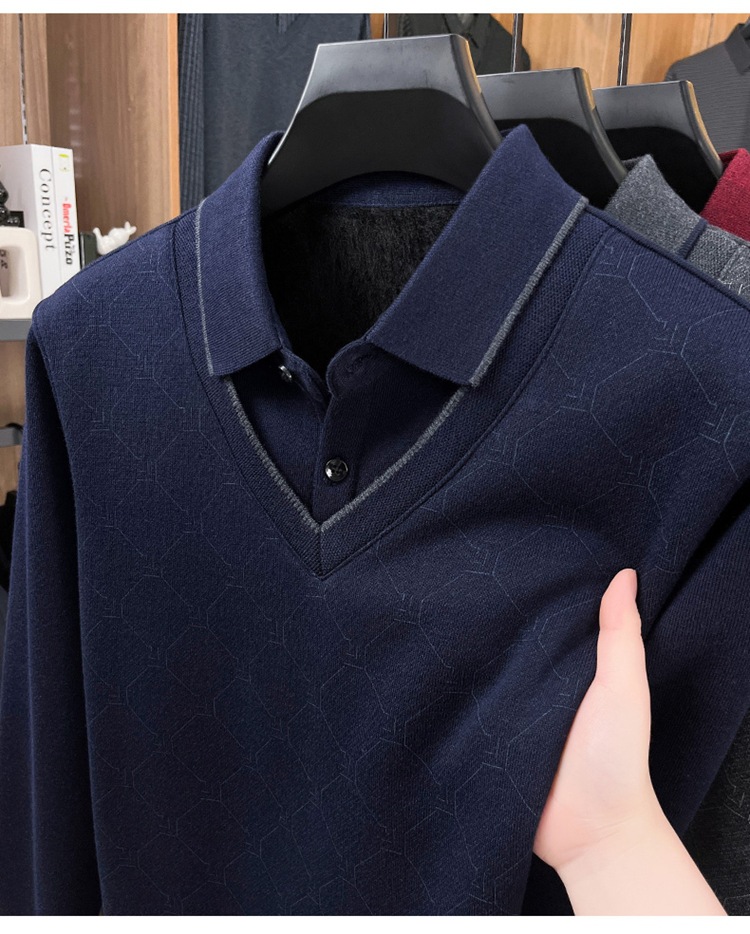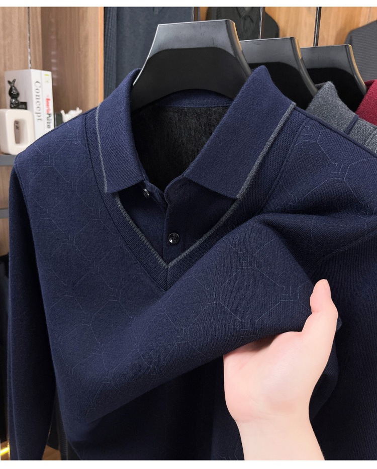 зимний свитер с флисовой подкладкой, утолщенный, для мужчин, повседневный, с отложным воротником, фейковый двукомпонентный теплый базовый свитер для мужчин среднего и пожилого возраста