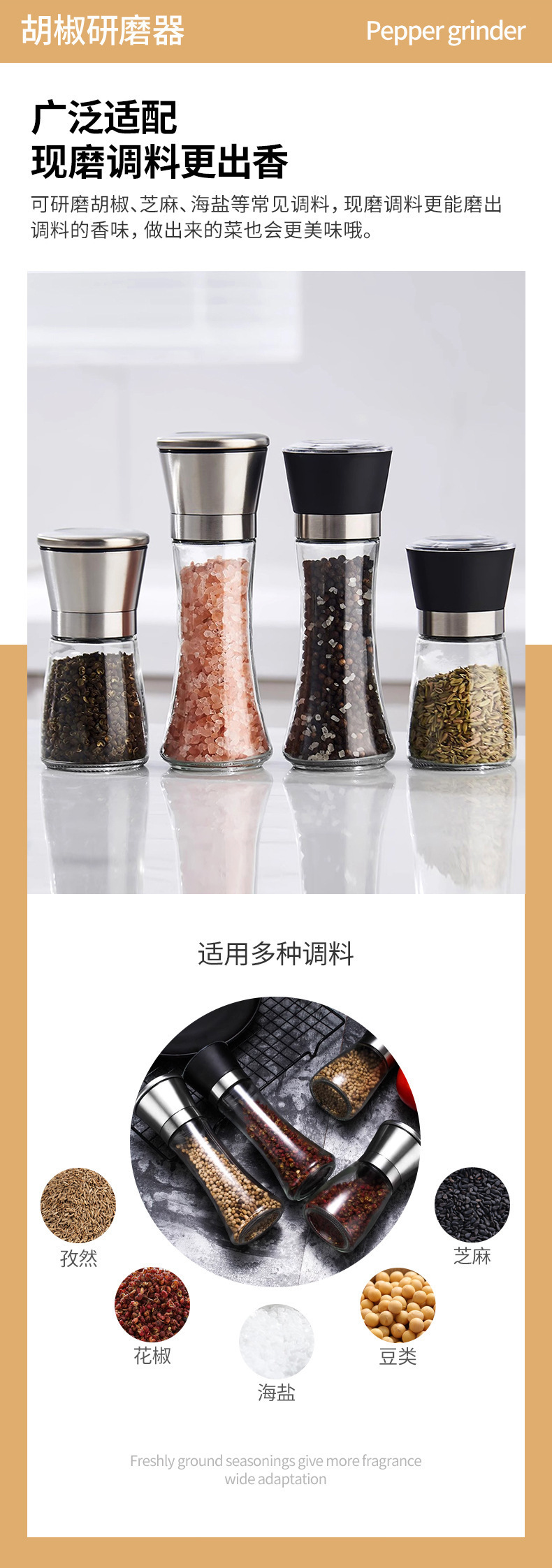 Ручная мельница для специй из нержавеющей стали, бутылка для молотого морской соли и перца, стеклянная бутылка для приправ