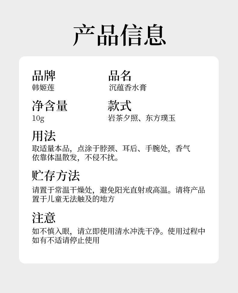 ![]() | 韩姬莲-1028沉蕴香水膏(岩茶夕照) | ¥3.0 / ≈ 36 ₽ | 23590 | 6145966914201 | |
