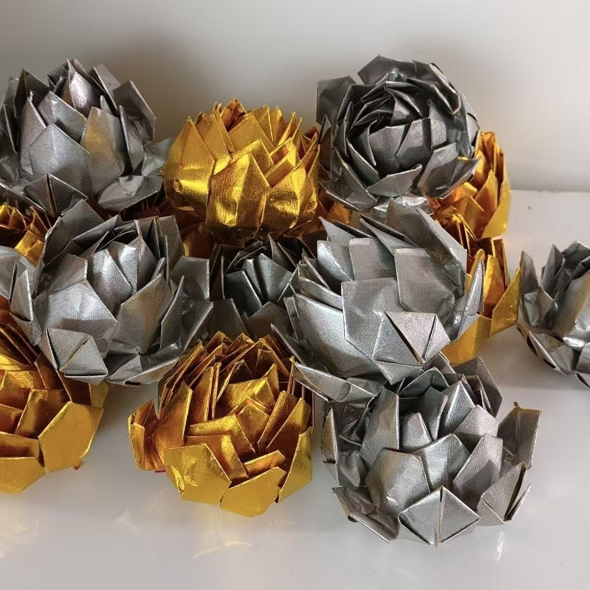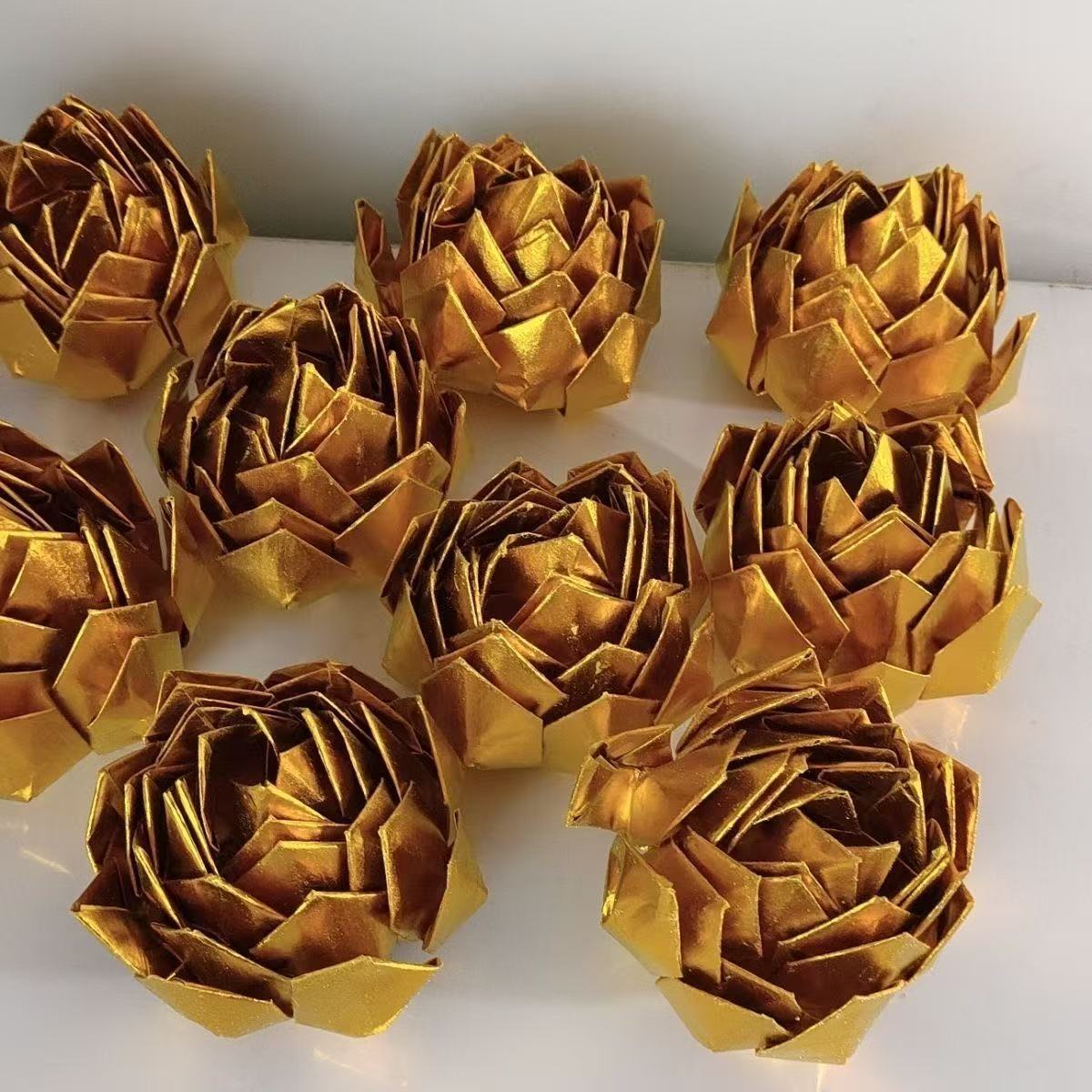 Золотой лотос, набор из 9 маленьких золотых цветов лотоса, готовый продукт, отправка, складывающийся, около 15 см в диаметре, ручная работа