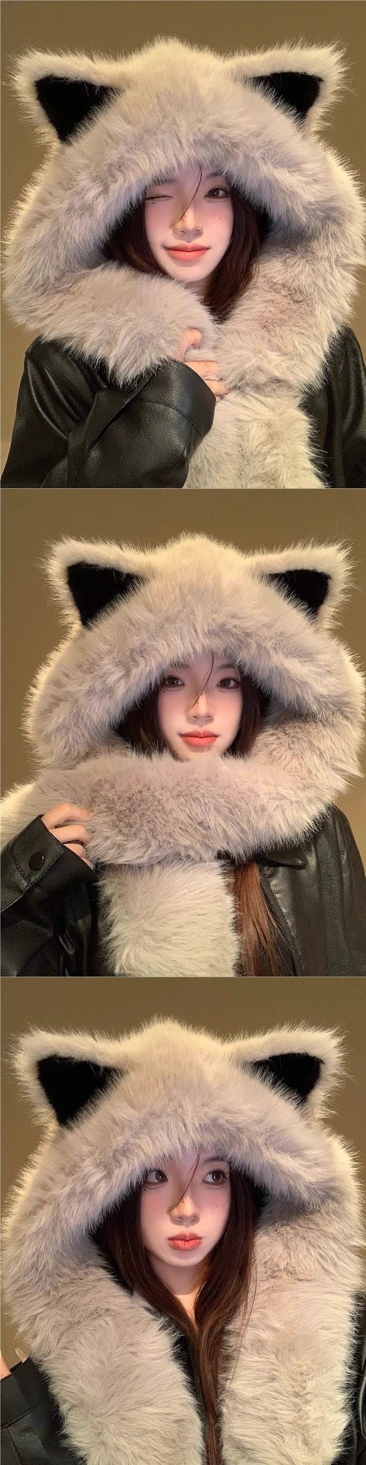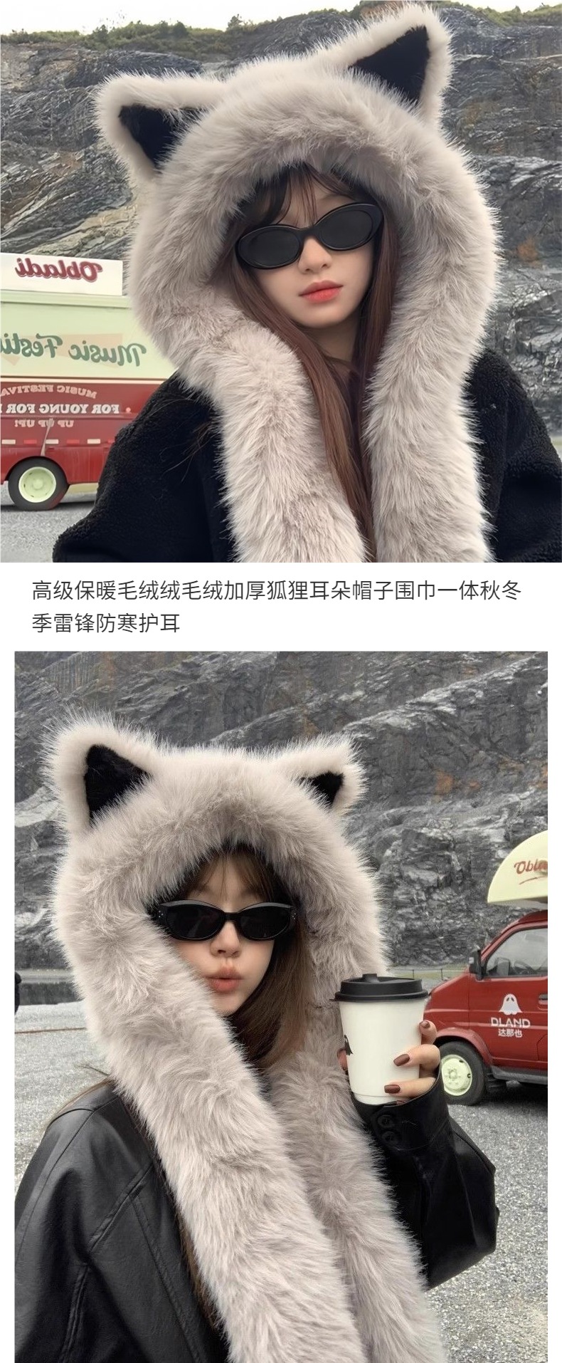 Новая плюшевая шапка-скарф с ушами лисы зимняя пушистая 2024 для сужения лица теплая защитная шапка