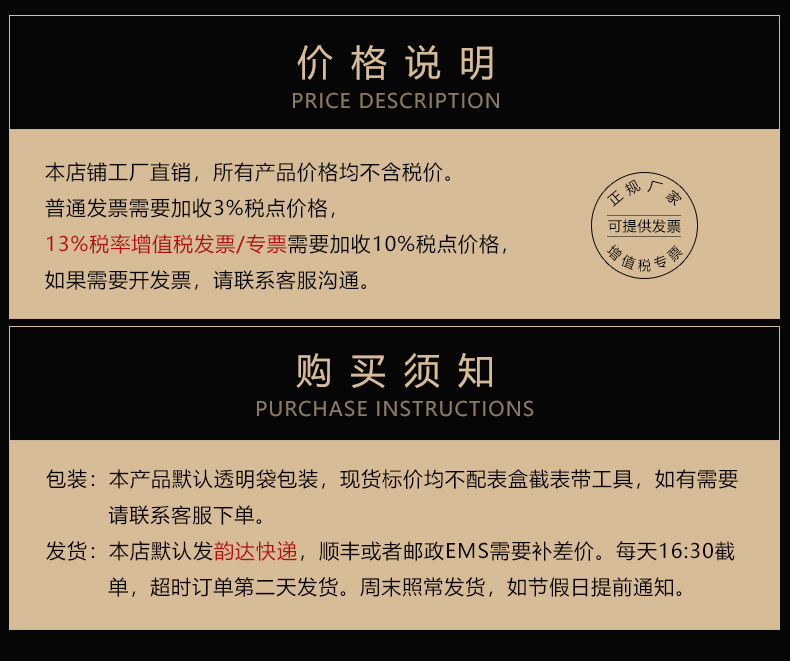 方案三:人为损坏的只可帮忙维修。运费都是客户承担。机芯方面的问题免费帮忙维修,需要更换配件的问题,根据不同配件收取相对应的费用。如果您觉得很难以接受或者只想定一次货物者,请慎重选择,因为你们在选择供货商的时候,我们同时也在选择客户,我们只想选择长期合作的顾客。