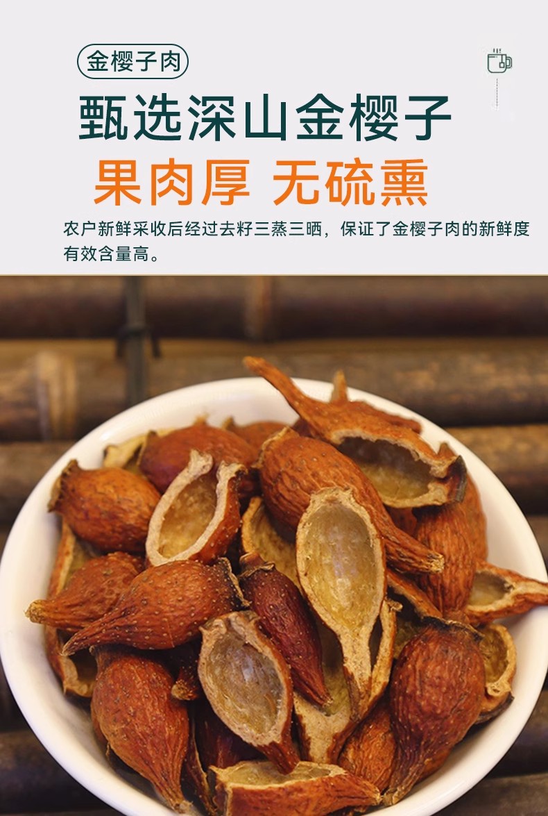 ![]() | Three-steamed and three-dried golden cherry meat + 500g each of gorgon fruit | ¥62.0 / ≈ 747 ₽ | 2000 | 5946379493189 | |