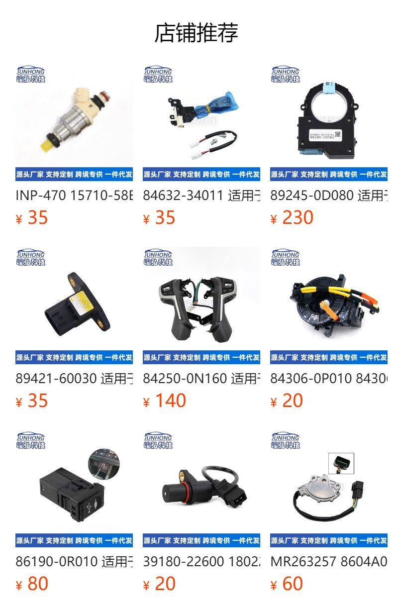 主营产品:气囊游丝、玻璃升降开关、空燃比氧传感器、点火线圈、喷油嘴、大灯疝气灯泡、大灯疝气电脑板、倒车灯开关、刹车灯开关、门灯开关、ABS转速传感器、空气流量计、咪表/车速传感器、正时机油控制阀/VVT阀、水温传感器、倒车雷达、多功能方向盘按键、定速巡航开关、汽油泵芯/汽油泵总成、汽油格/汽滤、曲轴位置传感器、凸轮轴位置传感器、节温器、继电器、大灯喷水枪、燃油压力传感器、空调压力传感器、鼓风机马达、怠速马达、点火开关、尾盖锁机、爆震传感器、阳光传感器、室外温度传感器、节气门总成、风扇电机、气囊碰撞传感器,游丝角度传感器等系列汽车电器产品。