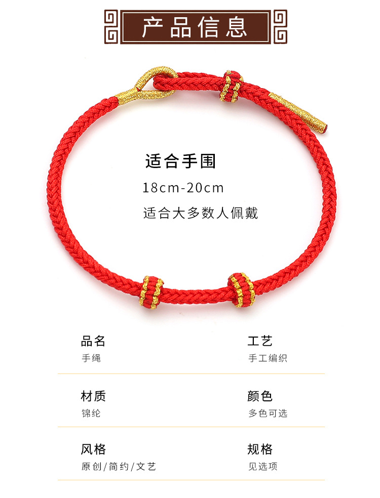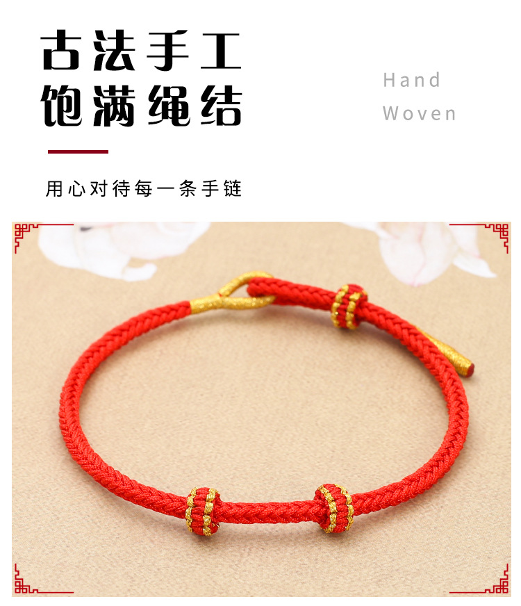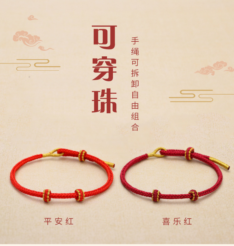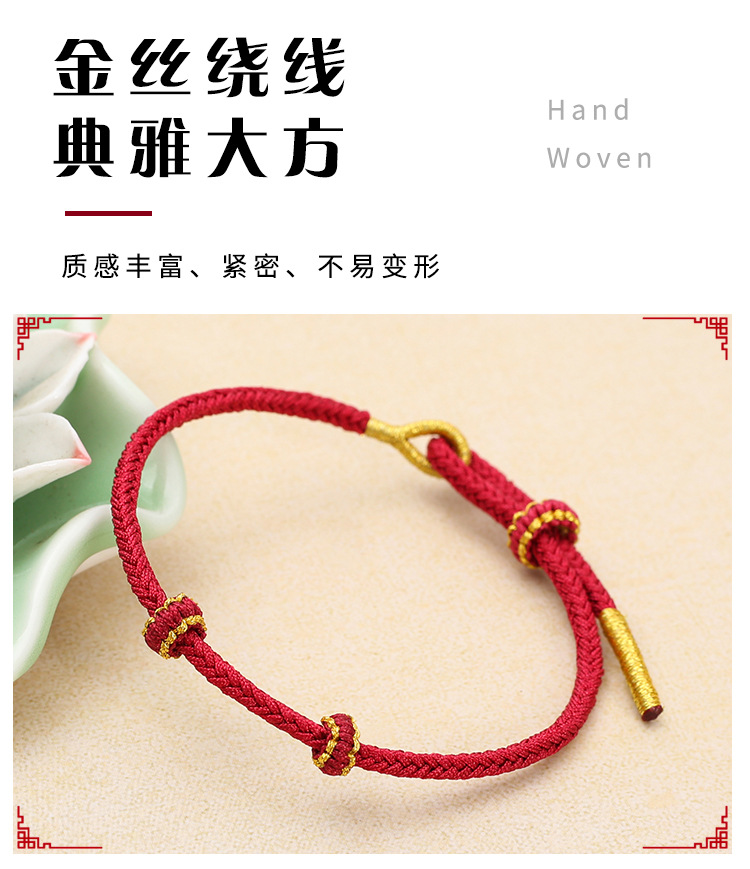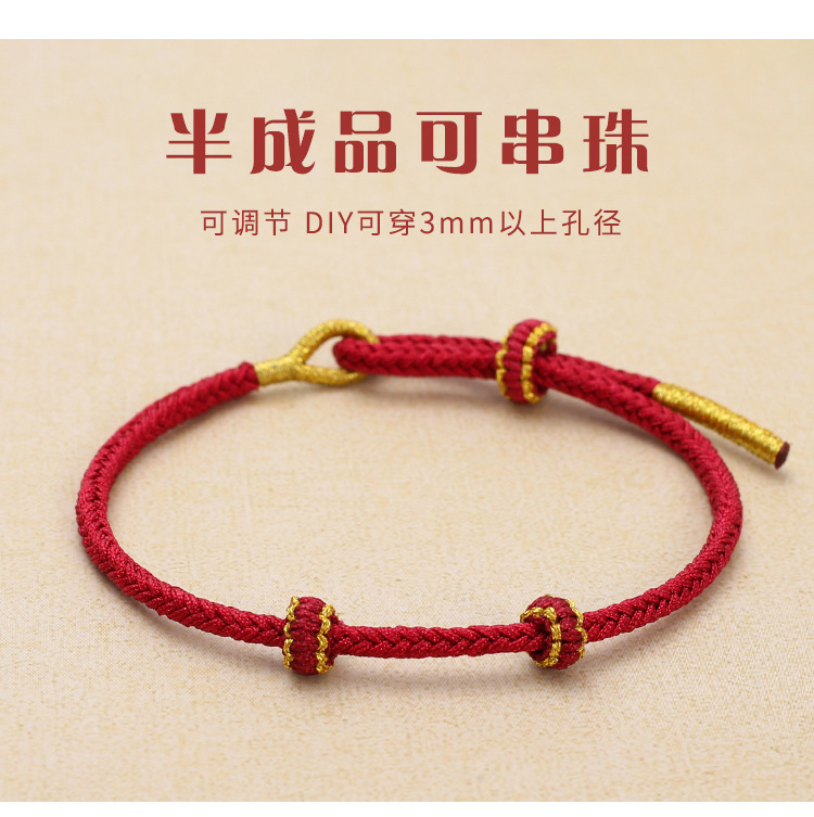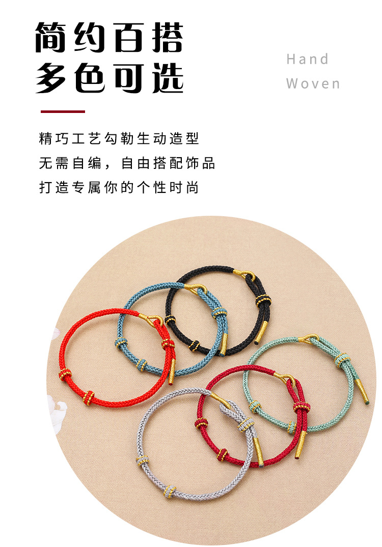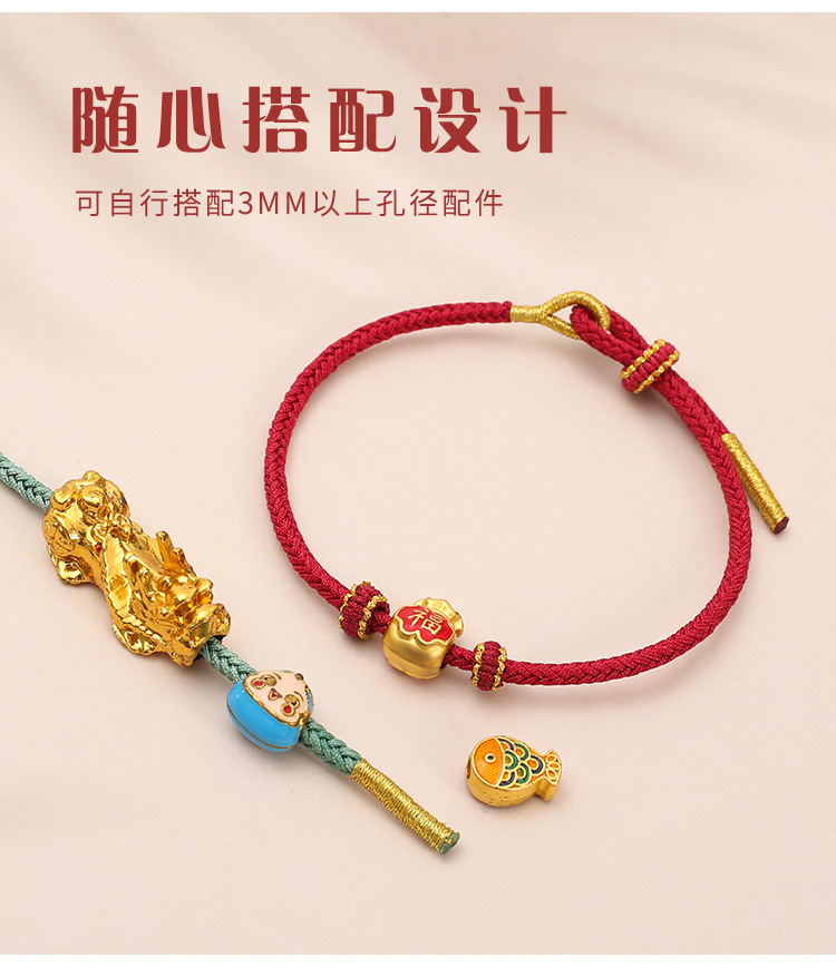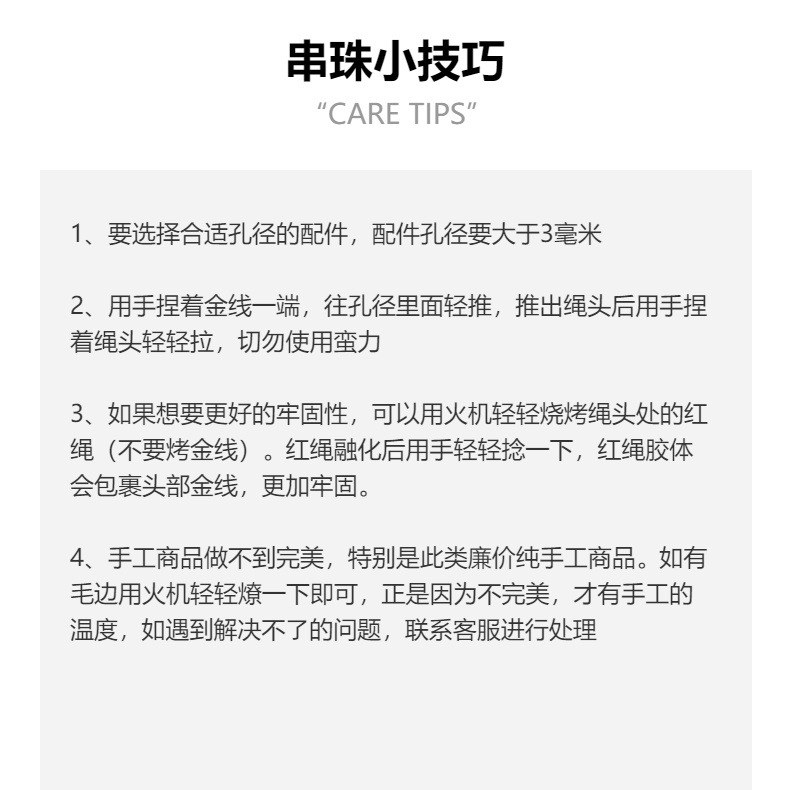 温馨提示:金线不具有火烧粘结的特性,所以用该款式穿珠的时候,请务必保证配件孔径大于绳体直径,穿孔的时候用手捏着金线头小心穿入,请勿蛮力硬拉。如因操作不当导致金线脱线,无法进行售后,诚信交易,互相理解,谢谢!