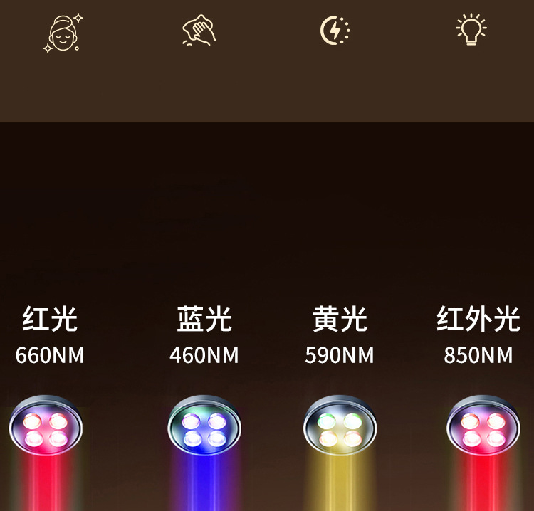 9.工作模式:四种,红光660NM+850NM 蓝光450NM+660NM+850NM 黄光590NM+850NM 紫光450NM+590NM+660NM+850NM