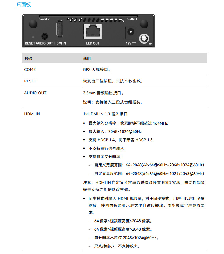 最大带载 65 万像素 极限宽度 2048,极限高度 2048。 超长屏极限宽度:8192,极限高度:2048(单网口带载在 65W 像素内) 1 路 LED 千兆输出网口 1 路立体音频输出接口 音频采样率固定为 48kHz。使用诺瓦多功能卡输出音频时,必须使用 48kHz 采样率的音频。 1 路 HDMI 1.3 输入接口 同步模式时,使用此接口输入的视频源,支持全屏自适应播放。