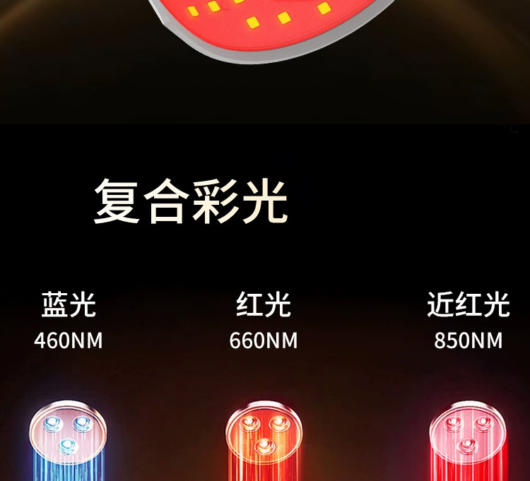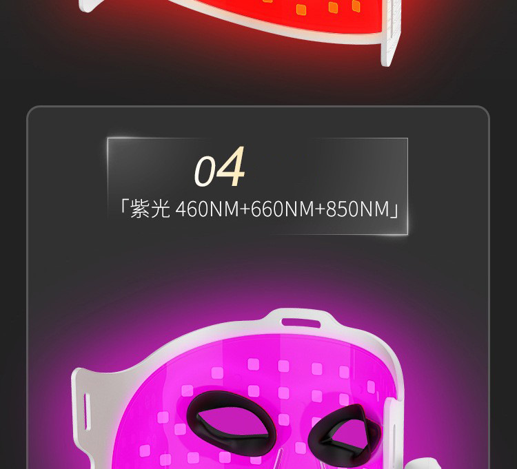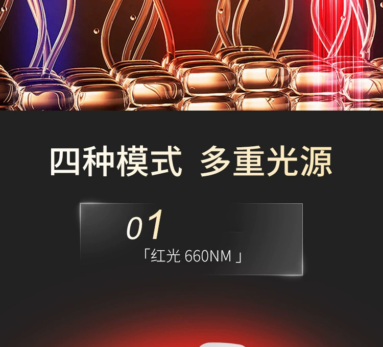 9.工作模式:四种,红光660NM+850NM 蓝光450NM+660NM+850NM 黄光590NM+850NM 紫光450NM+590NM+660NM+850NM