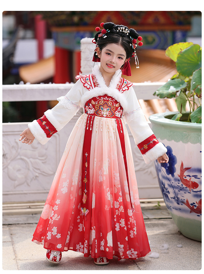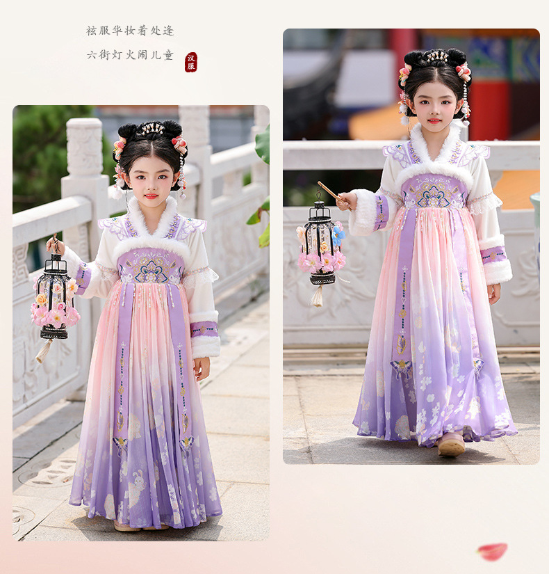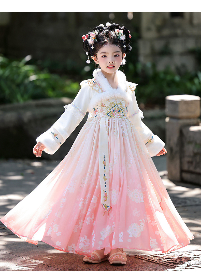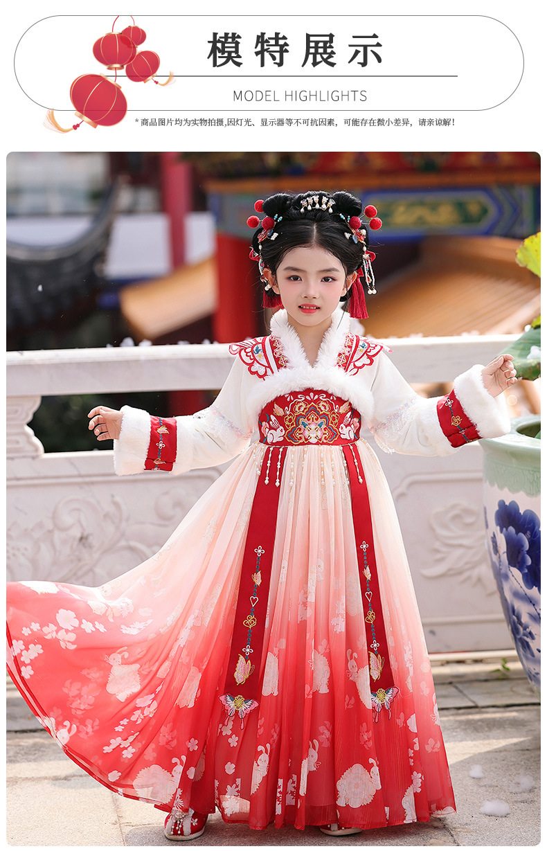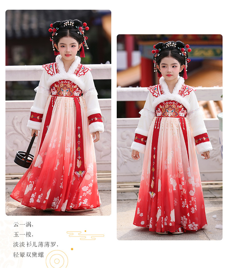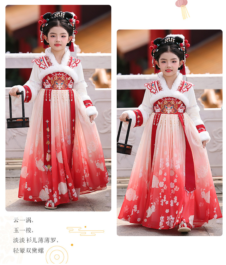 Платье для девочек в стиле Ханьфу с флисовой подкладкой, зимнее, теплое, китайский стиль, костюм Тан, для маленьких девочек, древний костюм