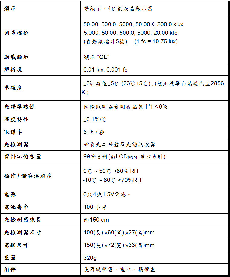 以色温2856K标准平面灯校正光谱准确性 f 1 < 6% 温度特性 ±0.1% 1℃ 取样率 数字显示每秒2.5次,模拟显示每秒13.3次 感光体 硅制光二极管及泸光镜片 记录组数 最多255组 操作温湿度 0℃ ~ 40℃,80%R.H.以下 储存温湿度 -10℃ ~ 50℃,70%R.H.以下 电 源 6颗1.5V AAA电池 电池寿命 连续使用约400小时 (碳锌电池) 光检测器引线长度 150cm 光检测器尺寸 150公分及92(长) × 60(宽) × 29mm(高) 电表尺寸 150(长) × 72(宽) × 35 mm (高) 重 量 320g 附 件 使用说明书、皮套、电池、RS-232连接线