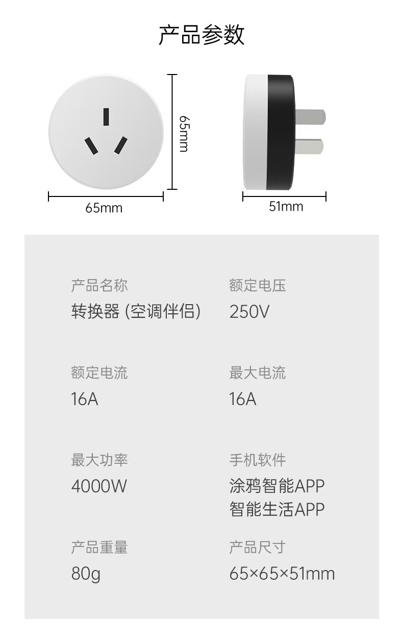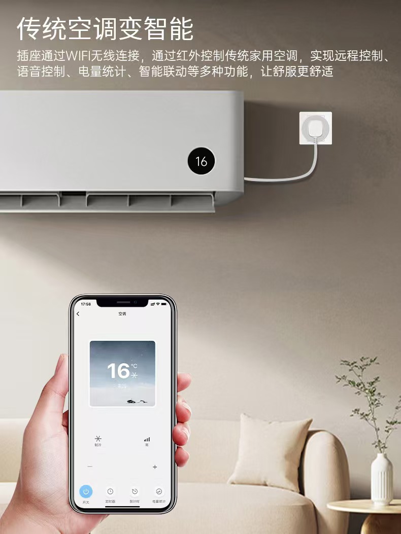 无需更换空调,只需将空调伴侣插在插座上,普通空调就能升级为智能空调,相比买新的智能空调,省钱又省力,租房、旧房改造都适用。