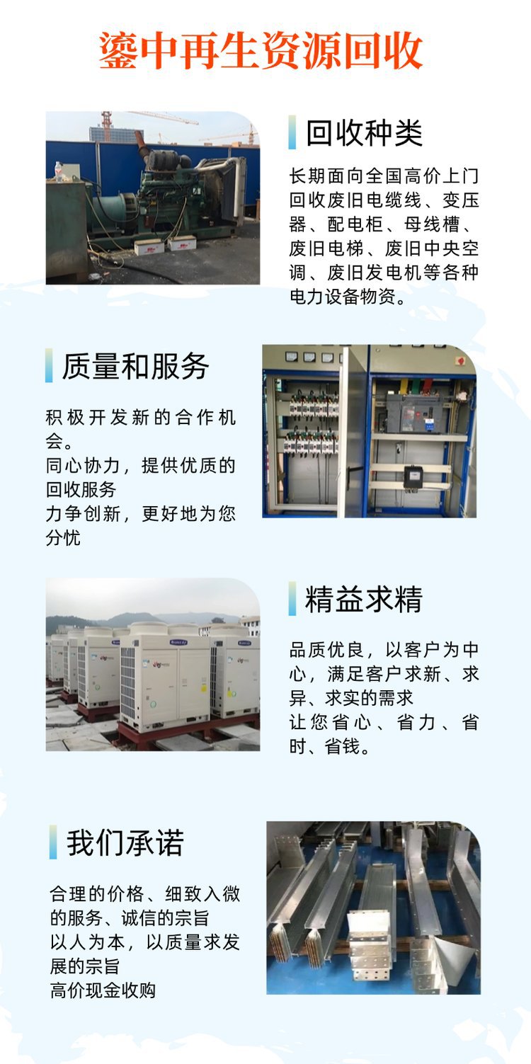 三、废旧废钢回收:电动机,发电机组、废旧变压器,配电柜,空调、机床、锅炉等废旧产品。