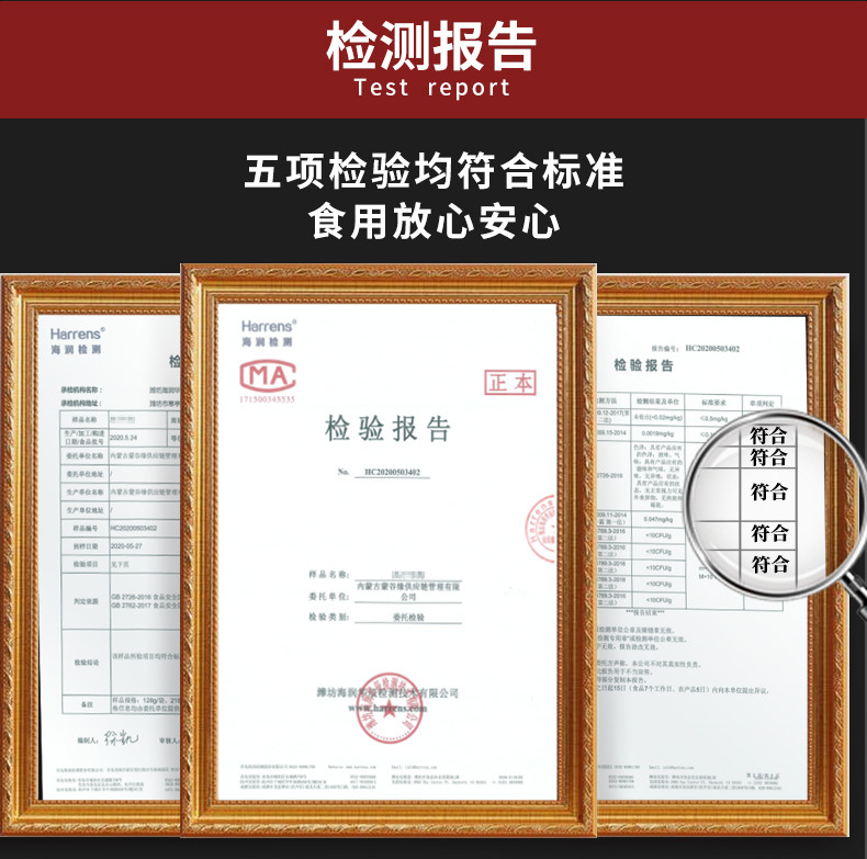 本店产品均经过食品检测报告检测,五项标准要求均符合国家食品标准,请放心购买食用。