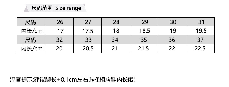 ![]() | Dark gray | Size 32 has an insole length of 20.4 cm | ¥45.0 / ≈ 542 ₽ | 129 | 6115464667401 | |
