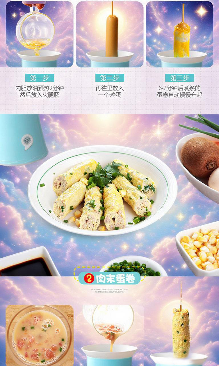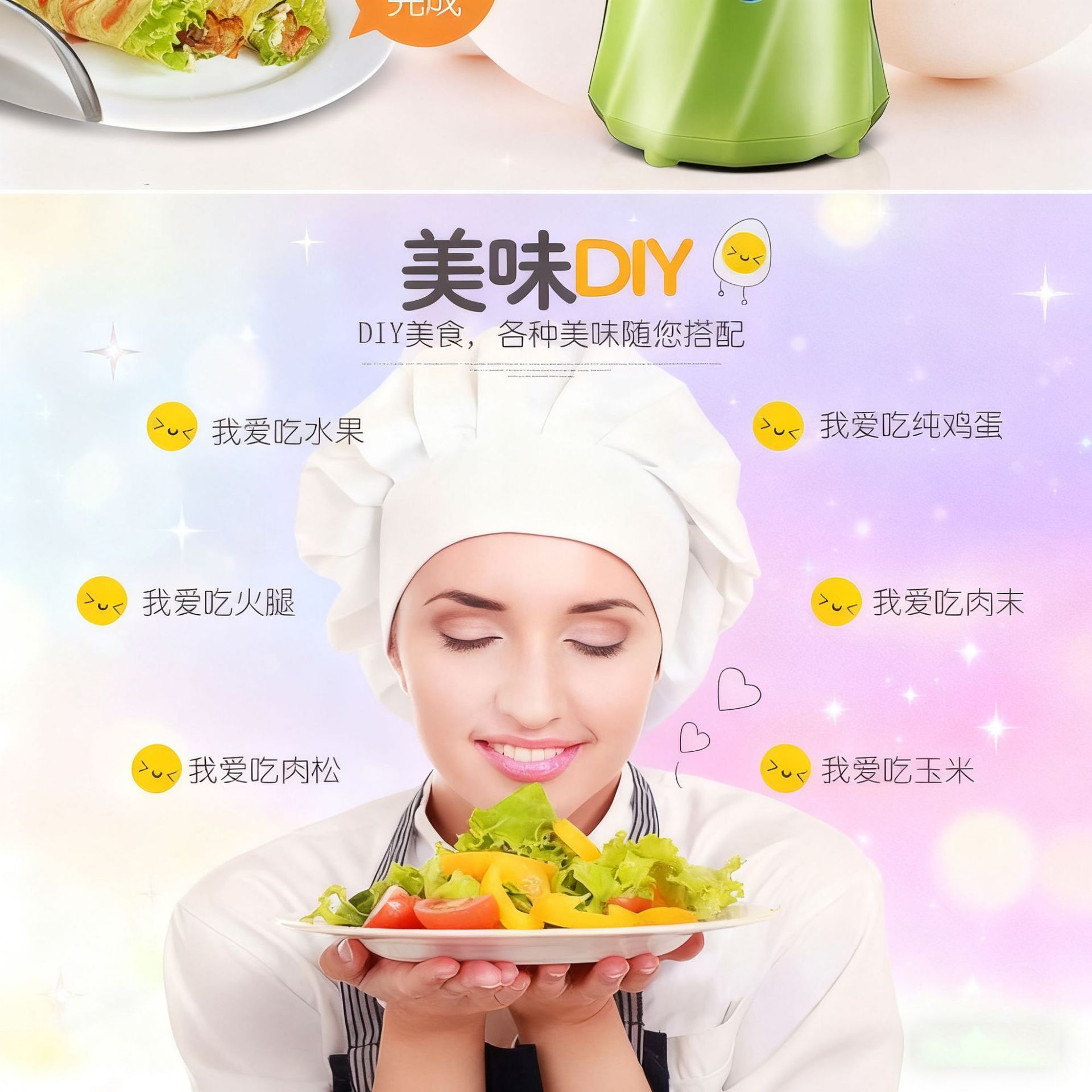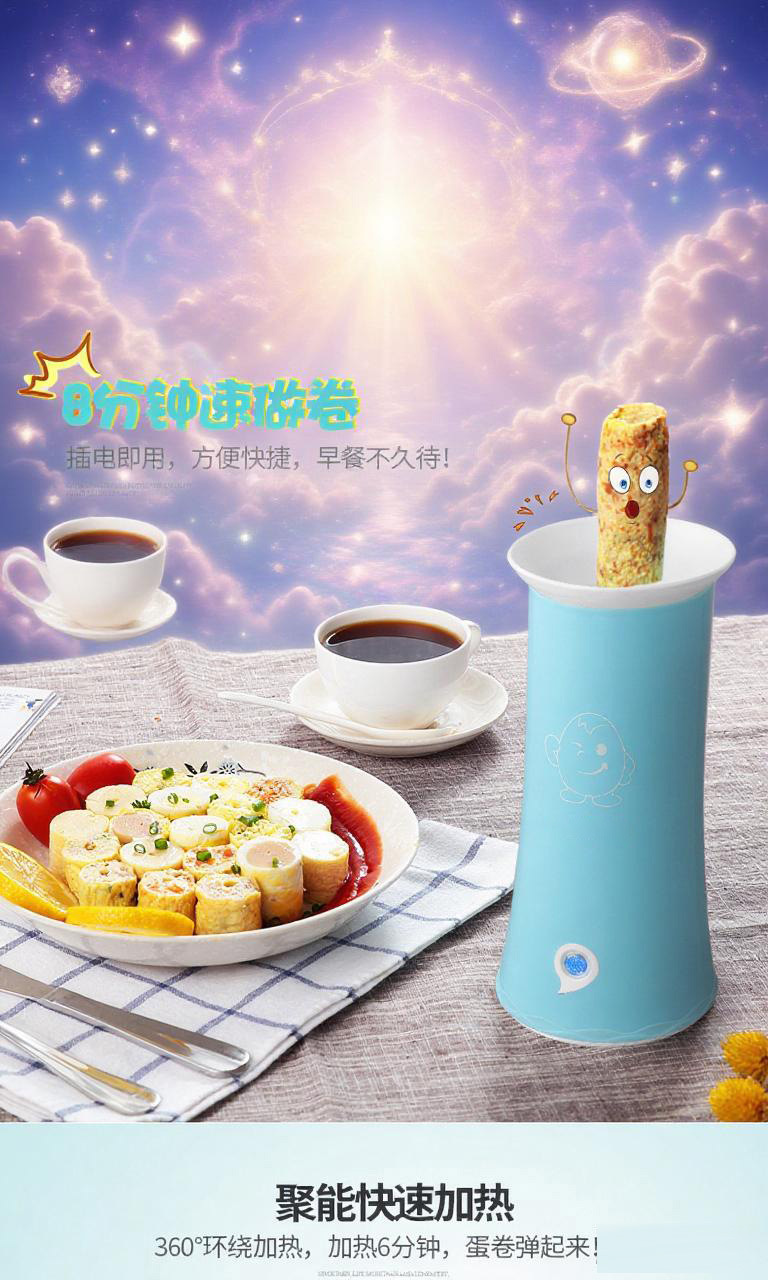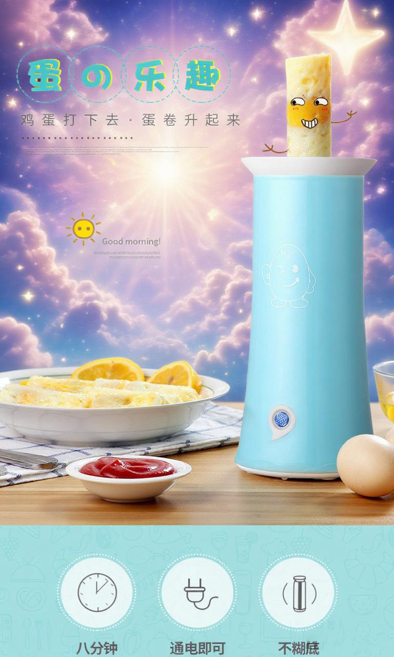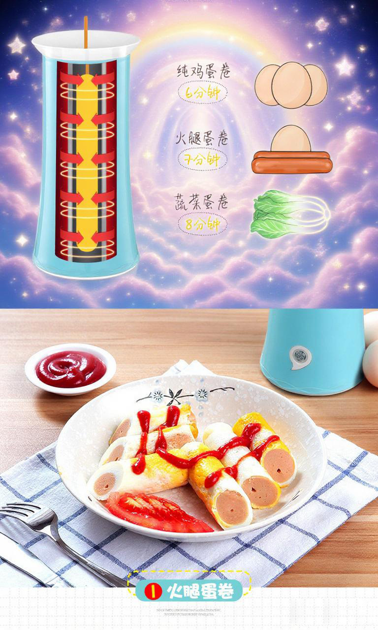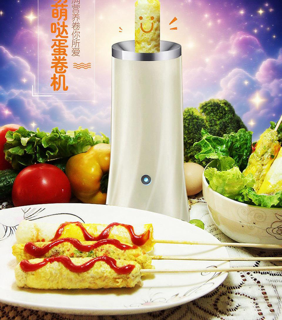 全自动操作 使用前预约机器5-8分钟,将鸡蛋打入1-2个,可根据喜好添加食材,例如火腿肠等,6分钟左右自动升起蛋卷