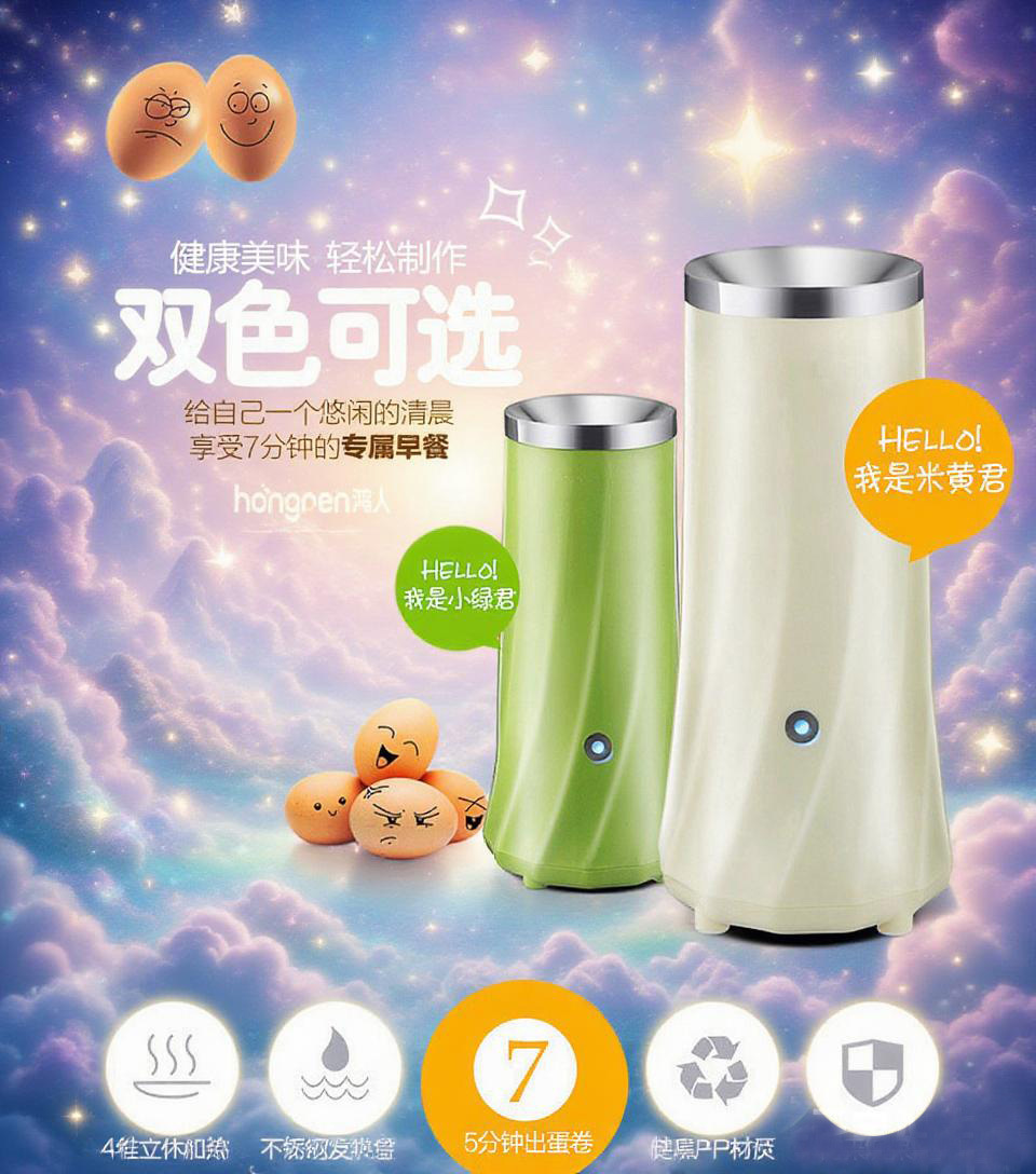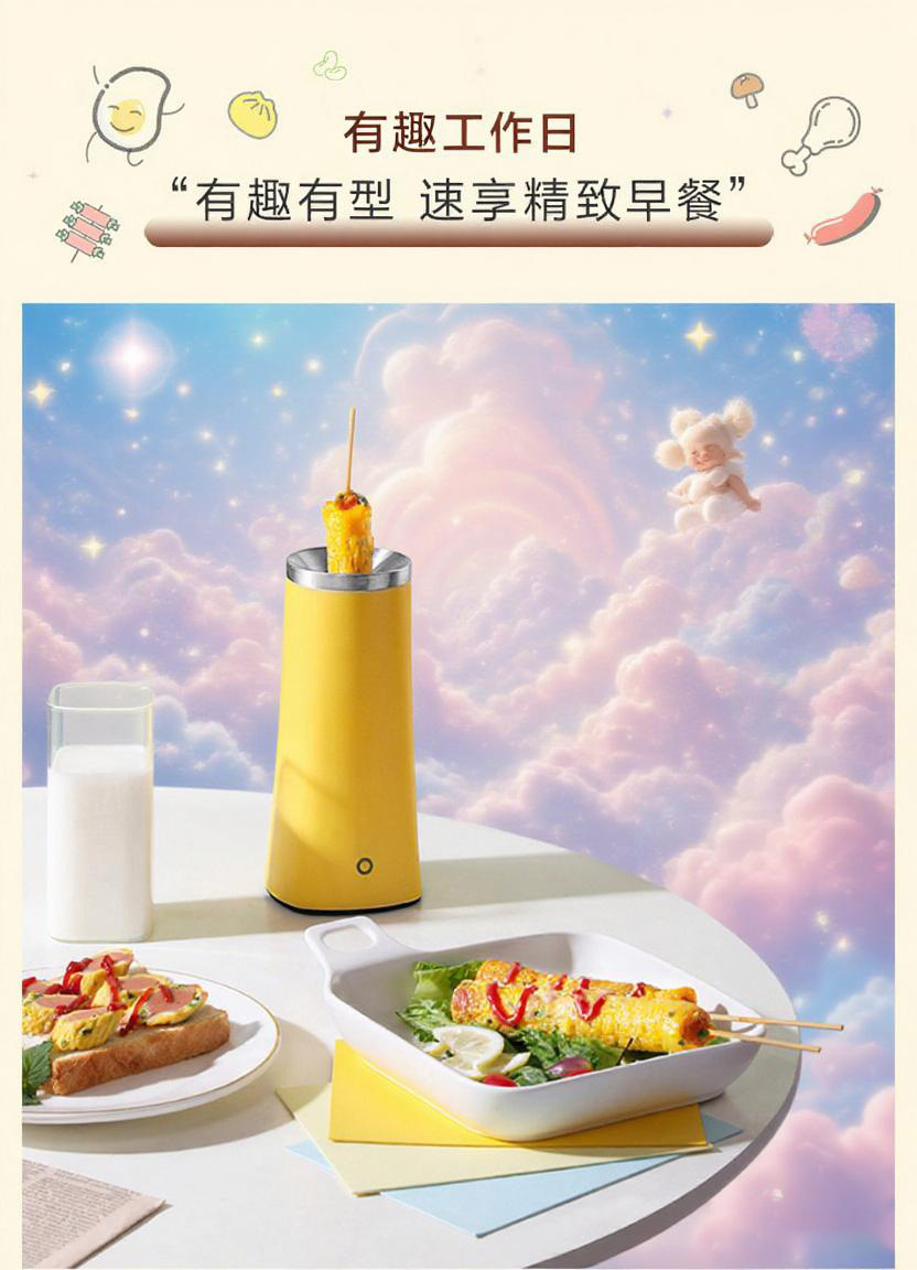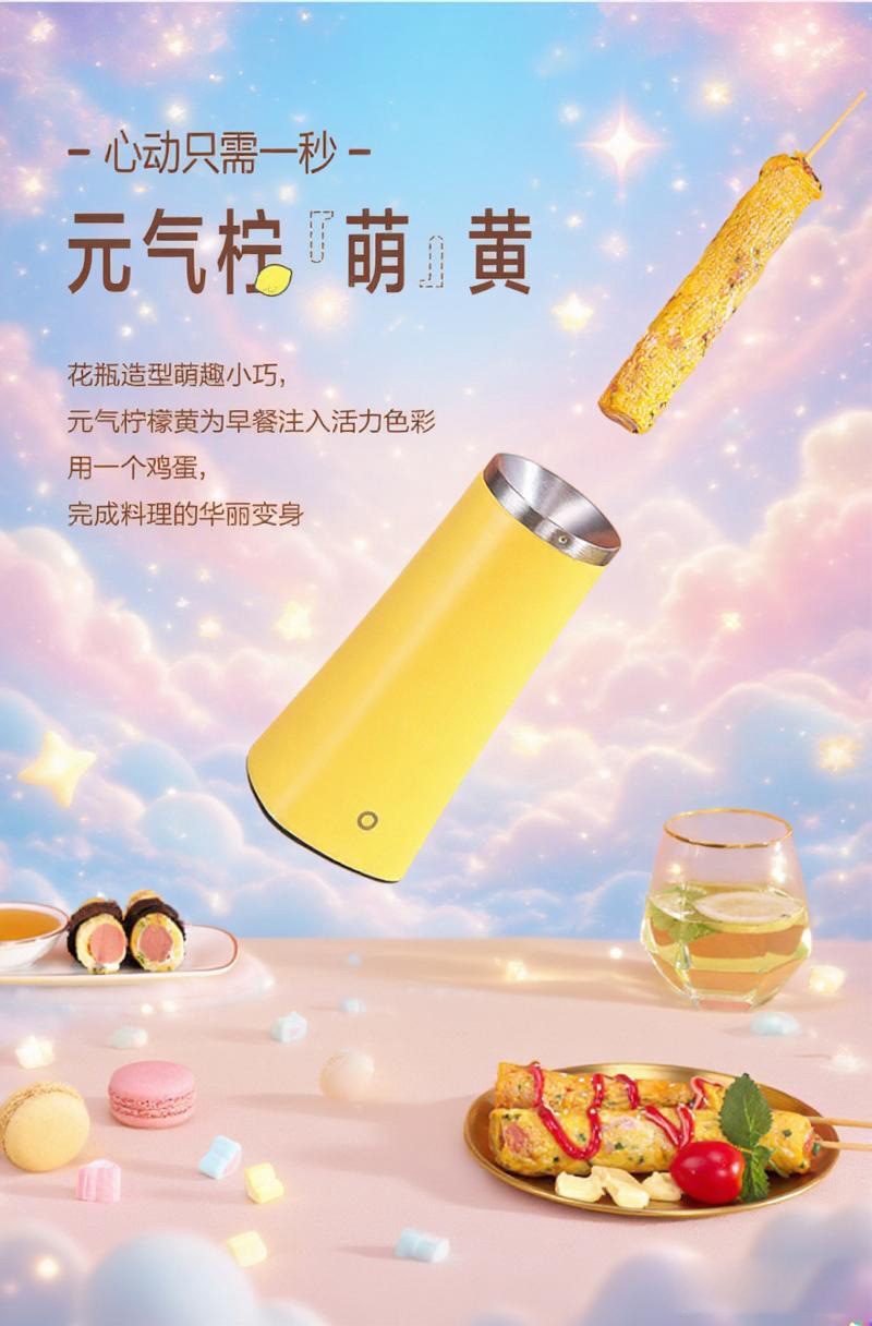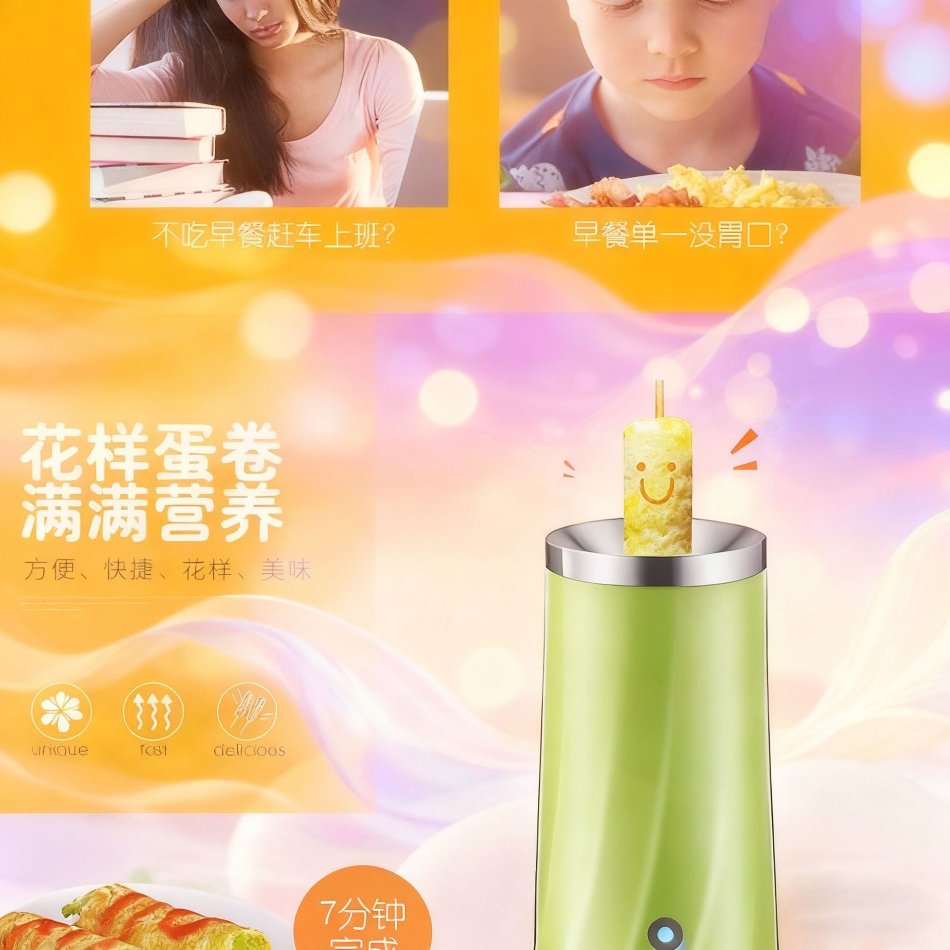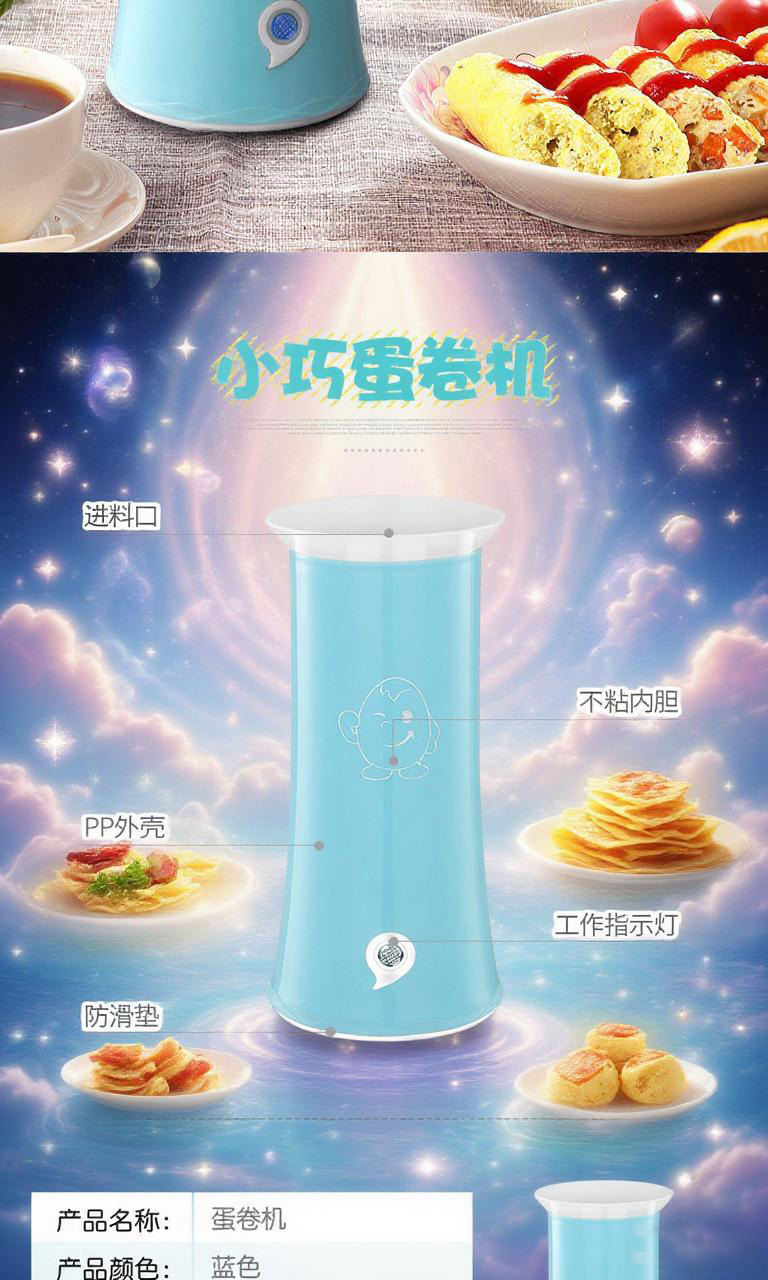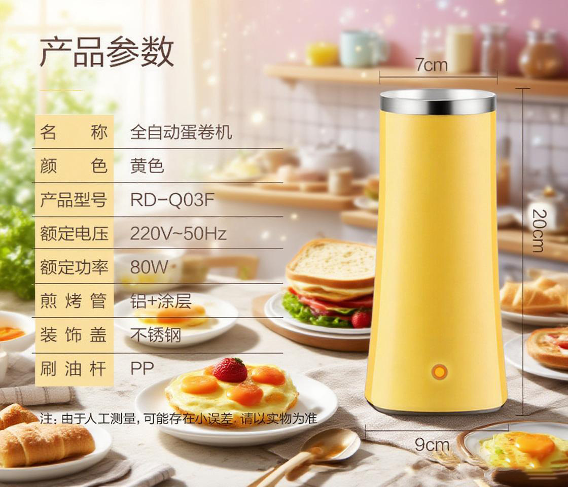全自动操作 使用前预约机器5-8分钟,将鸡蛋打入1-2个,可根据喜好添加食材,例如火腿肠等,6分钟左右自动升起蛋卷