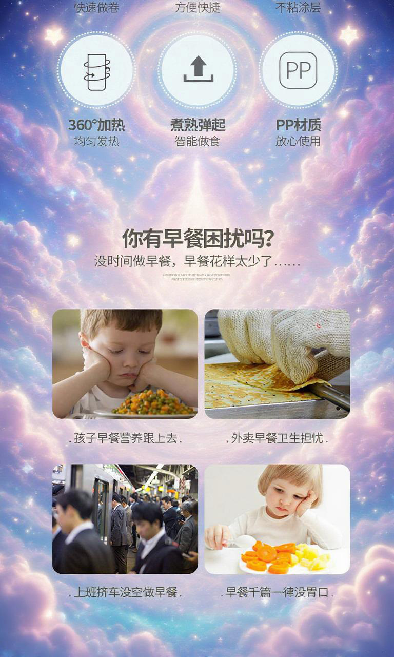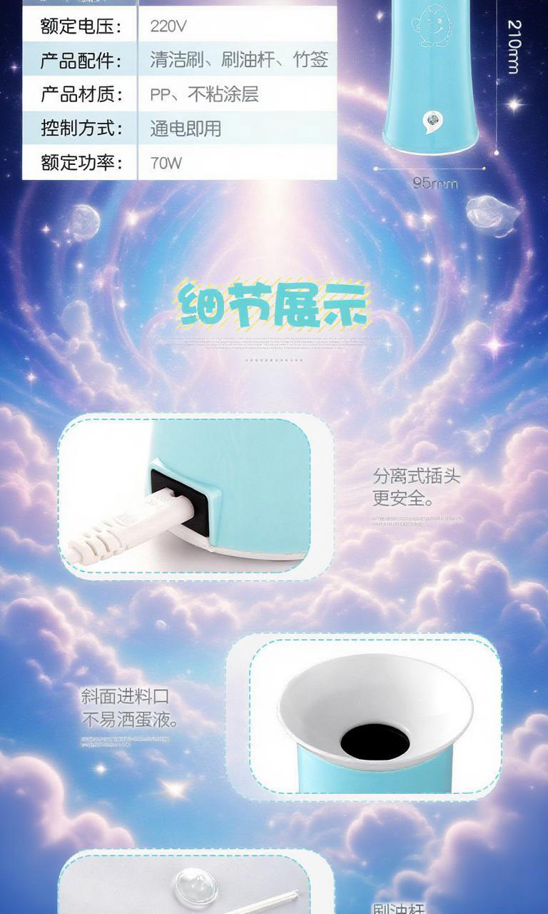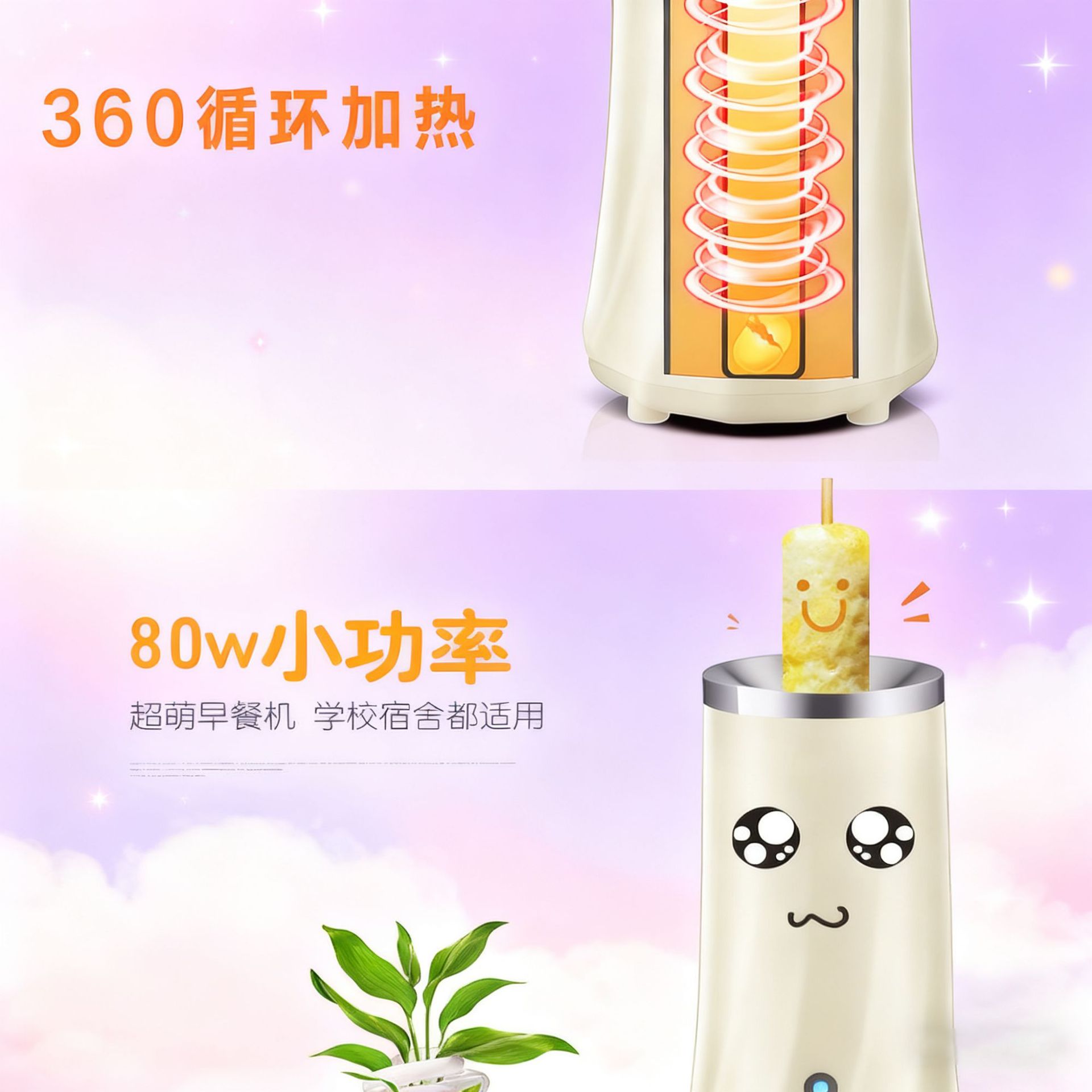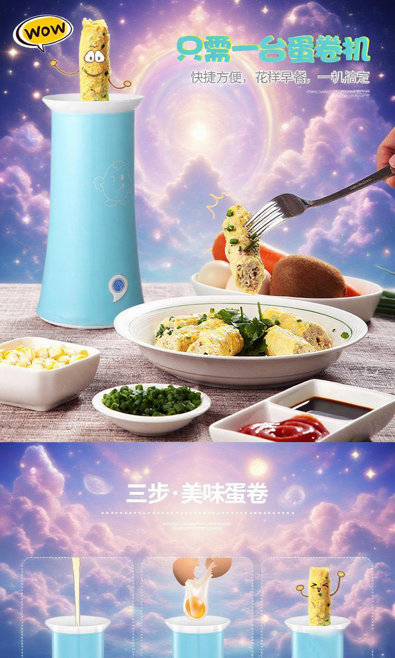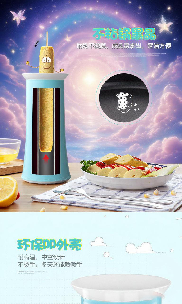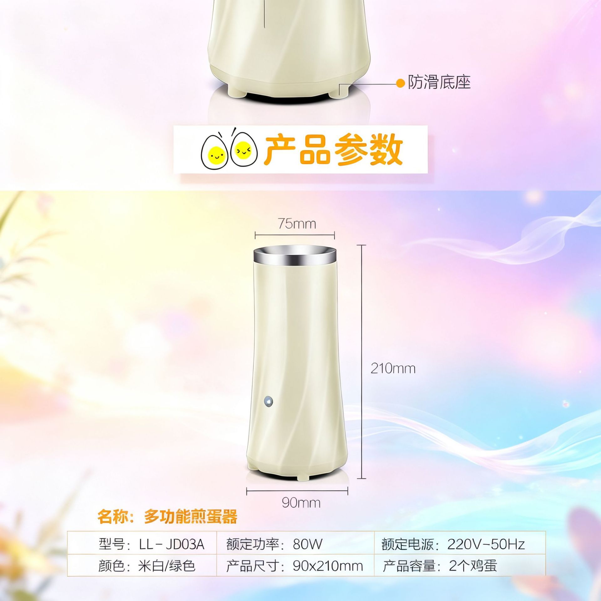 全自动操作 使用前预约机器5-8分钟,将鸡蛋打入1-2个,可根据喜好添加食材,例如火腿肠等,6分钟左右自动升起蛋卷