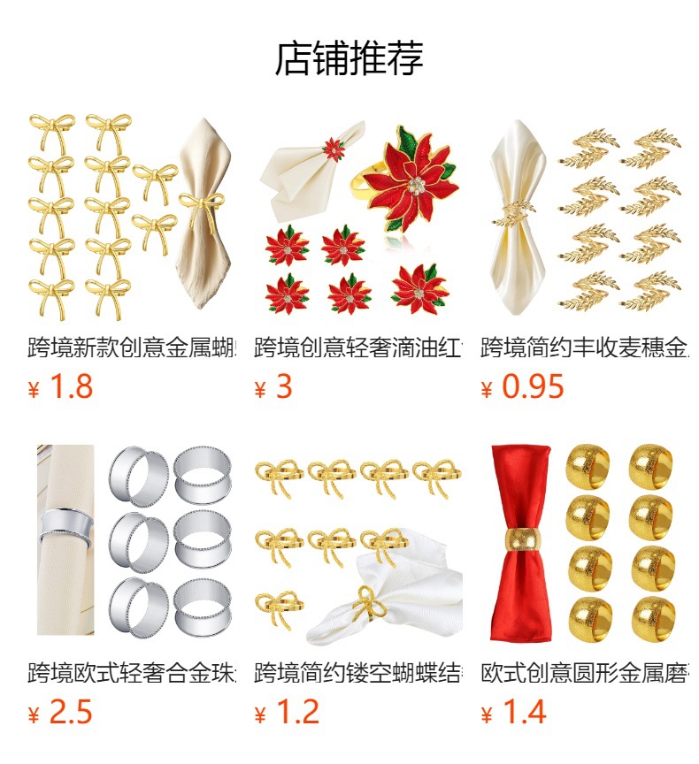 ![]() | Alloy d-shaped napkin ring matte gold | 1шт: ¥1.30, 9999шт: ¥1.20 | 9974600 | 6116805587555 | |