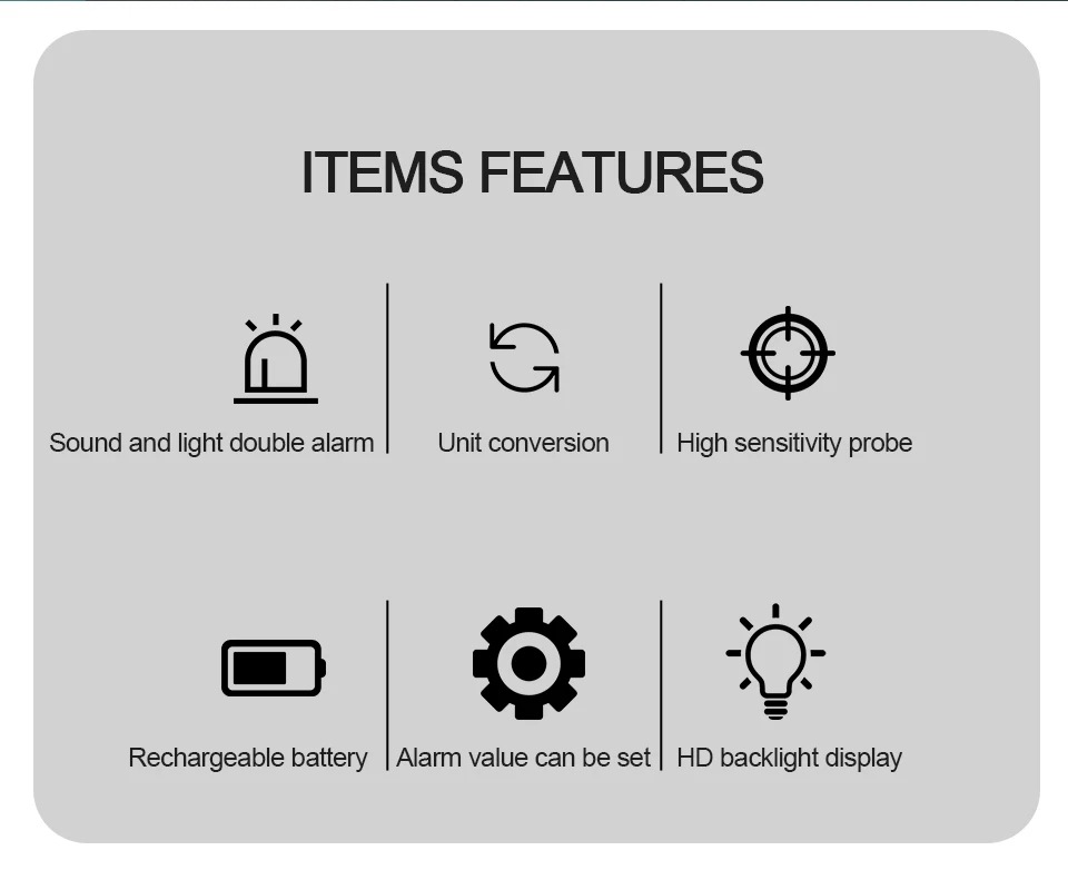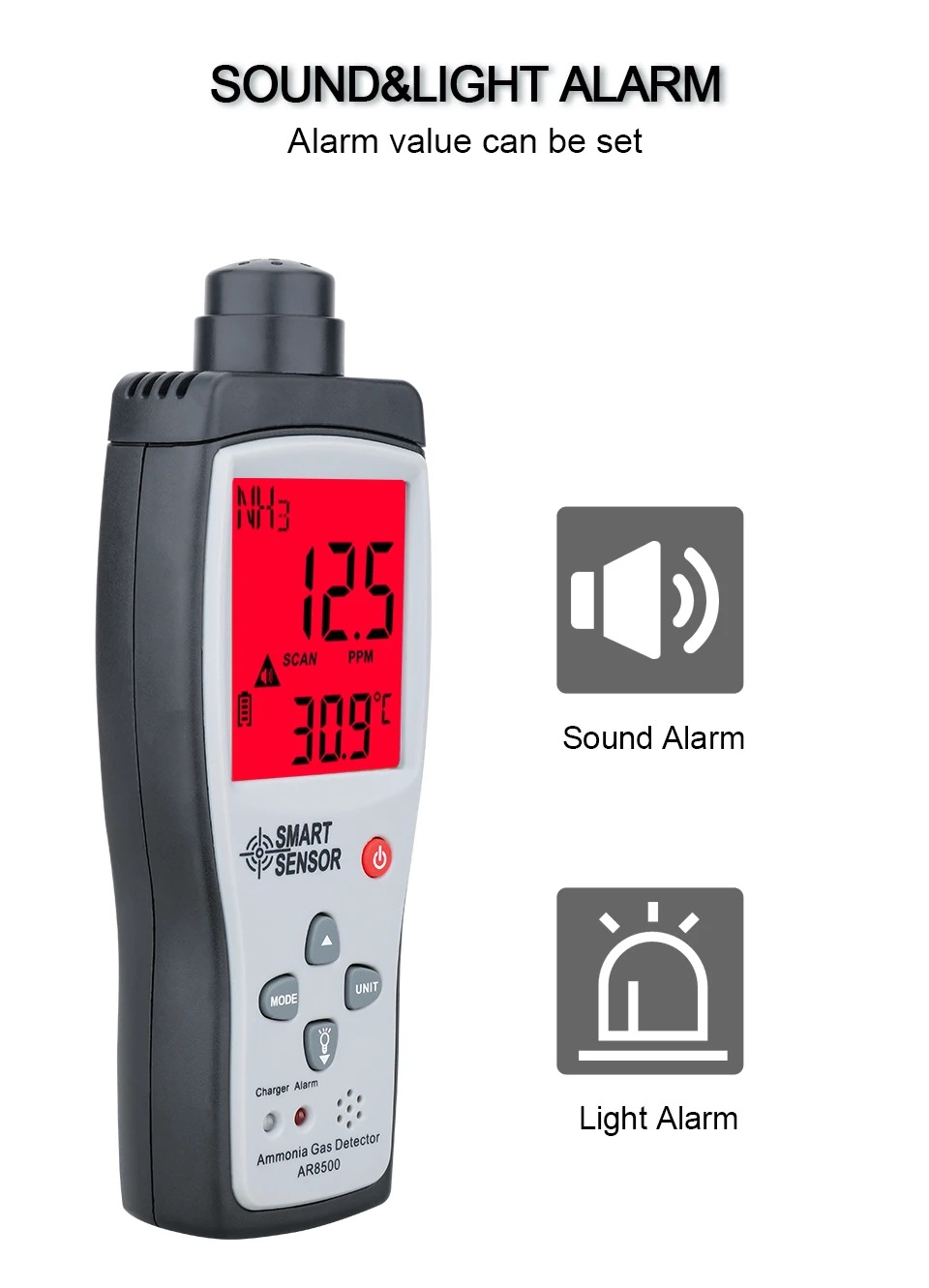 Acoustic, optical double alarm, can set the alarm value, an alarmsound is divided into 80 dB |