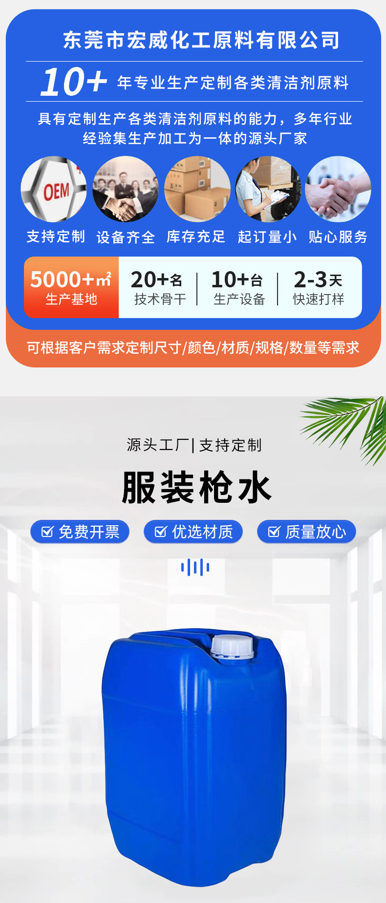 二、产品用途:主要用于纺织厂、制衣厂等纺织品衣物上的油污清洗,也可清除布料纤维或其它衣物的污渍。