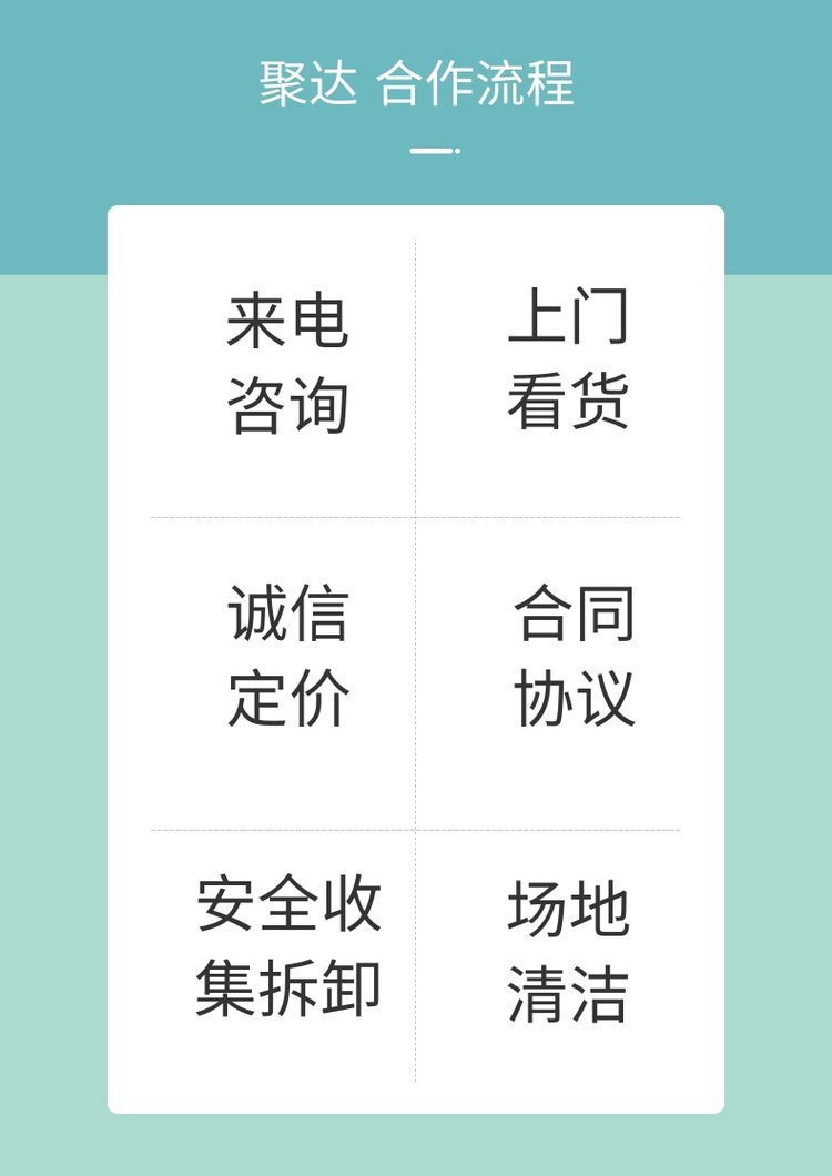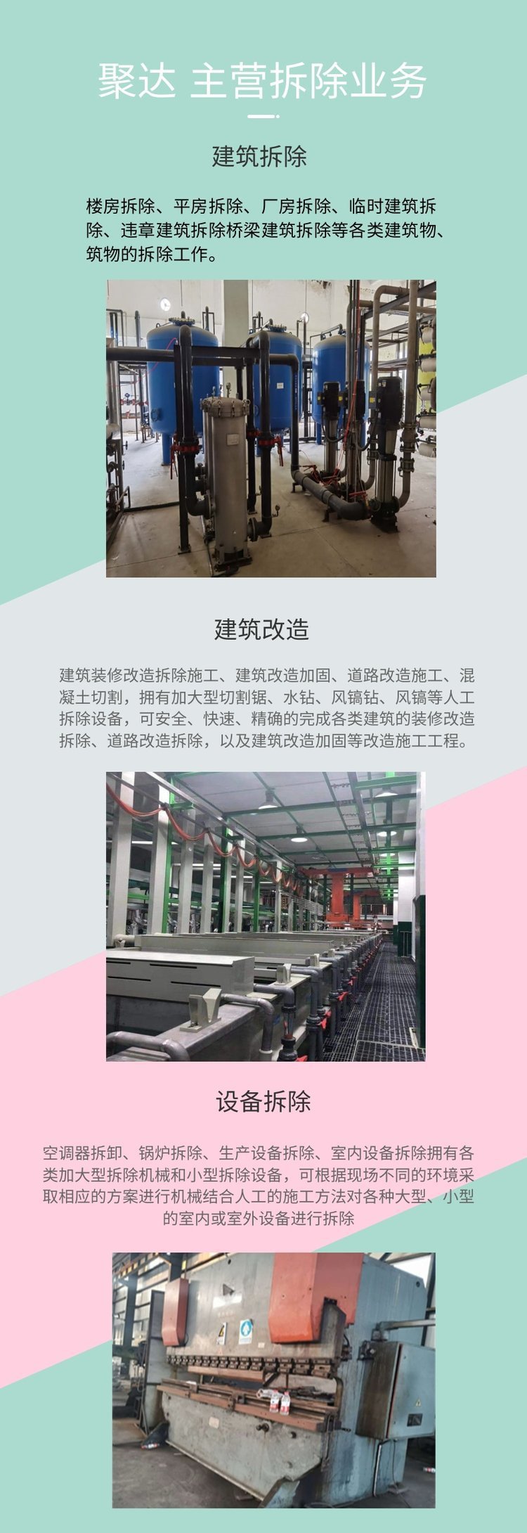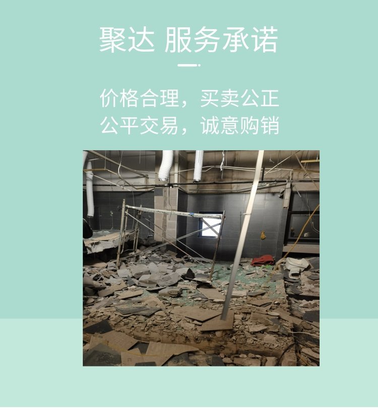 五、承包拆除工程。机械拆除楼房及大型厂房,负责垃圾托运并清理现场。废旧金属、废旧工业设备、废旧机械设备、废旧电子电器设备、废旧设备、空调、电脑及配件等面向对象:酒店、娱乐场所、建筑工地及家庭等。