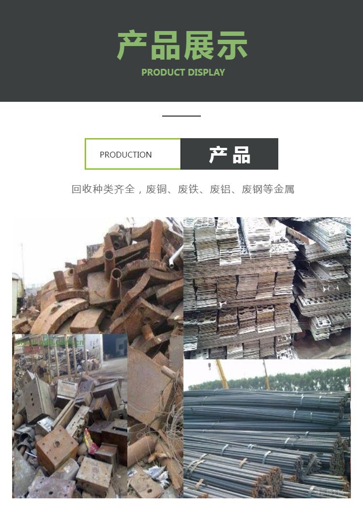 一家能处理各类生产性废旧不锈钢回收、废铜、废铁、废铝、电线电缆、二手废钢回收等的公司, 本公司拥有各种大型机械设备工具,其中包括废铁板剪板机、打包机、叉车、航吊、专业氧割,大型爪机、钢筋切粒机等设备工具。