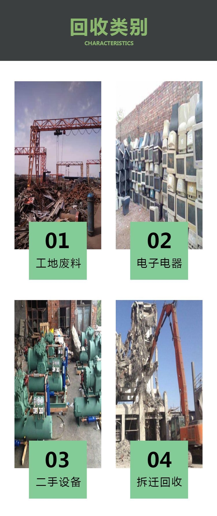 本公司承接回收各种废铁、钢铁、铜、铝、电线电缆、电机、电瓶、空调、制冷机组、电子元件、仪器设备、塑料、机床、废旧物资、医药设备、食品设备、饮料设备、化工设备、电脑、线路板等等,可提供上门服务,量大从优。 各类废品,精准报价。我们有专业队伍上门施工作业,持证上岗,合理交易,快捷。我们从企业单位的需求出发,试通过本网络平台的建立整合物资市场,使可资源合理的流通和科学的再利用。