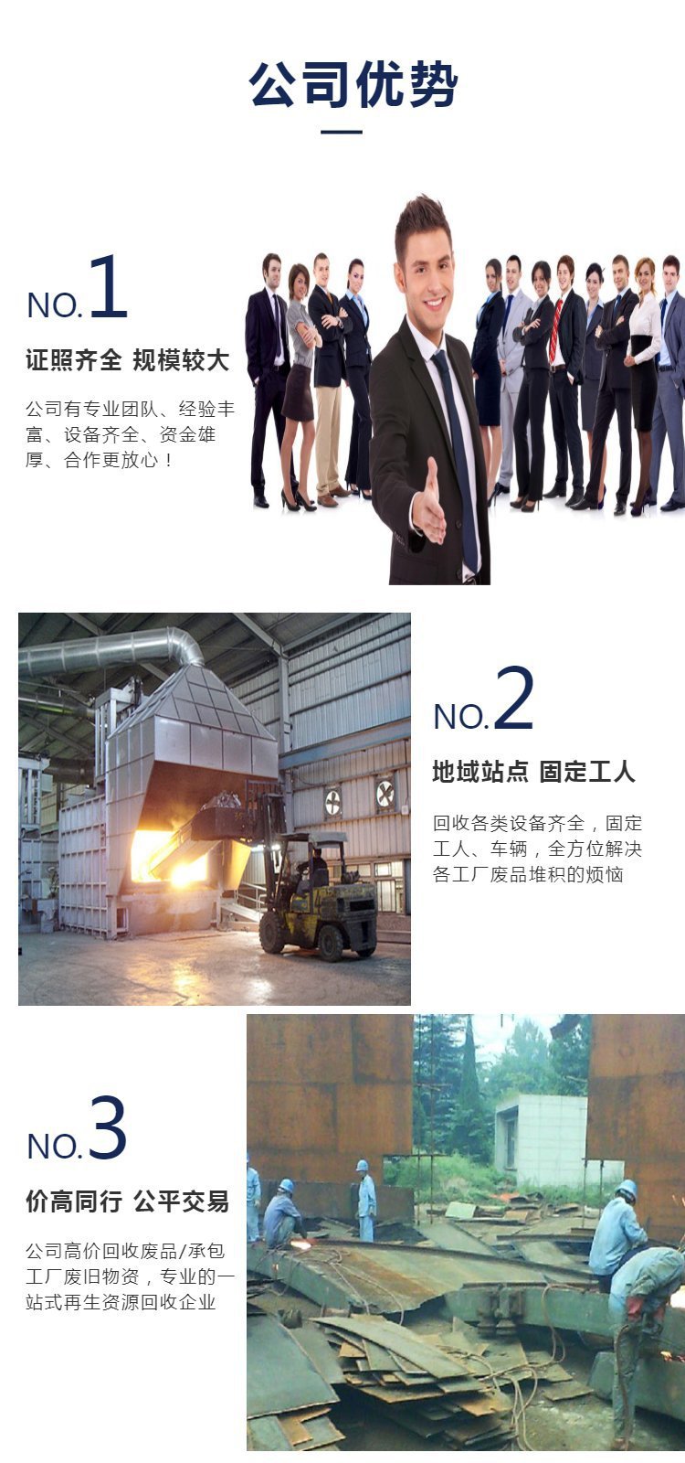 一家能处理各类生产性废旧不锈钢回收、废铜、废铁、废铝、电线电缆、二手废钢回收等的公司, 本���司拥有各种大型机械设备工具,其中包括废铁板剪板机、打包机、叉车、航吊、专业氧割,大型爪机、钢筋切粒机等设备工具。