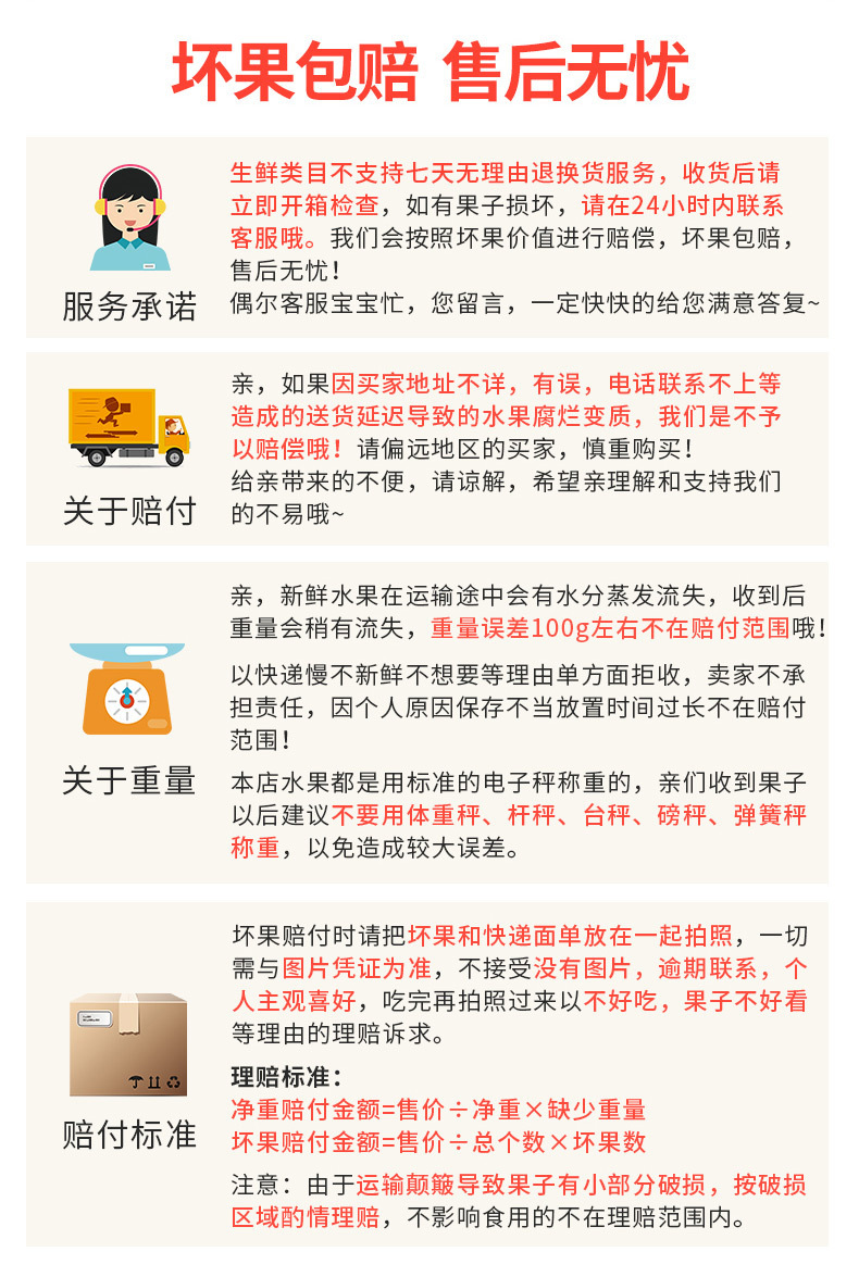 感谢亲对小店的信任,出于食品安全因素,本店商品不接受7天无理由退换货,冷冻冷藏产品不接受拒签,如果产品质量有问题,请拍照留证联系客服处理,谢谢!!!