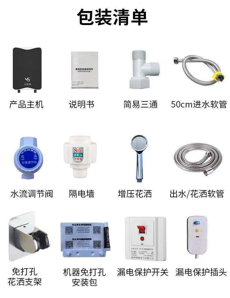 Список упаковки Host, manual, water flow regulating valve, insulation wall, shower set, body concealed accessories, leakage protection switch