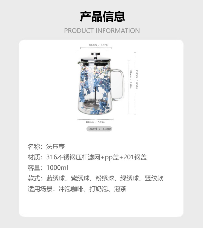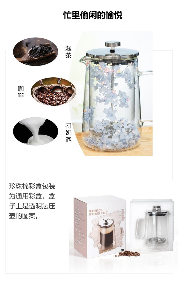 1000ML珍珠棉彩盒包装(通用彩盒,盒子上是透明法压壶的图案):16个/箱,74cm*43cm*59cm,18kg